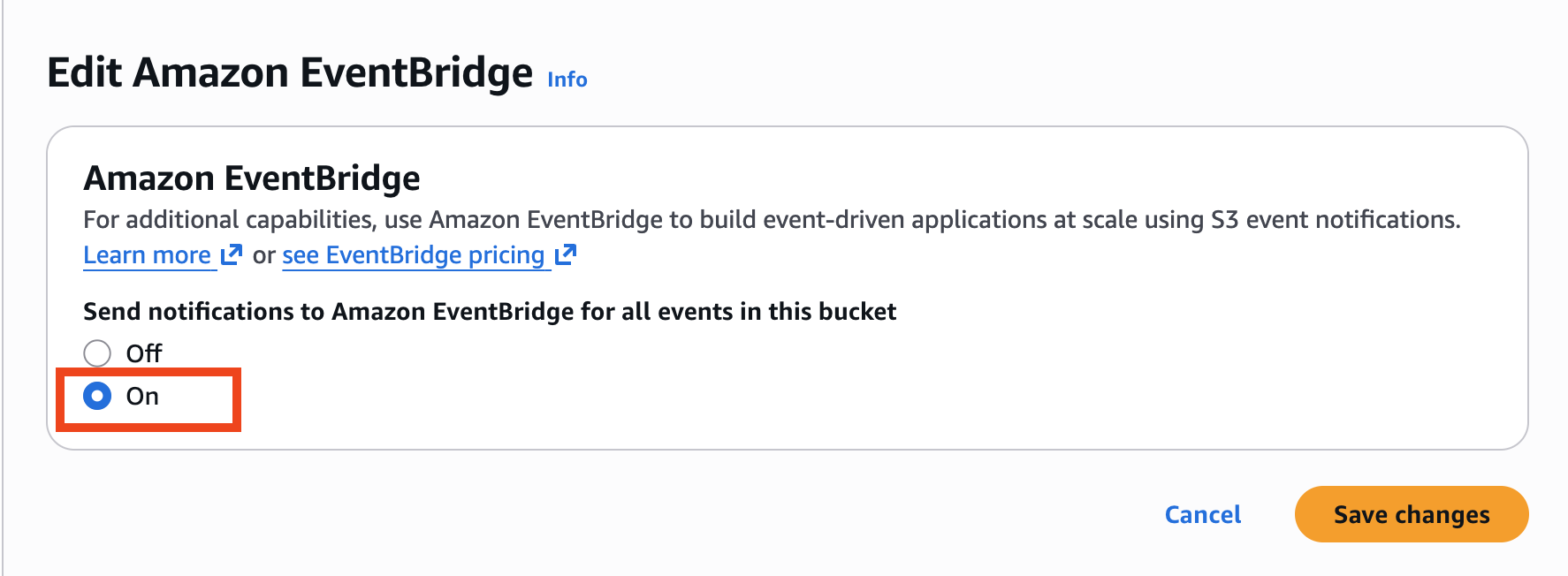 Click on the name of your S3 bucket, then click Properties and scroll down to Amazon EventBridge.