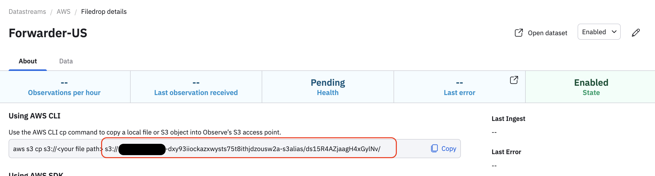 Next, create a Filedrop from an Observe tenant in the U.S.