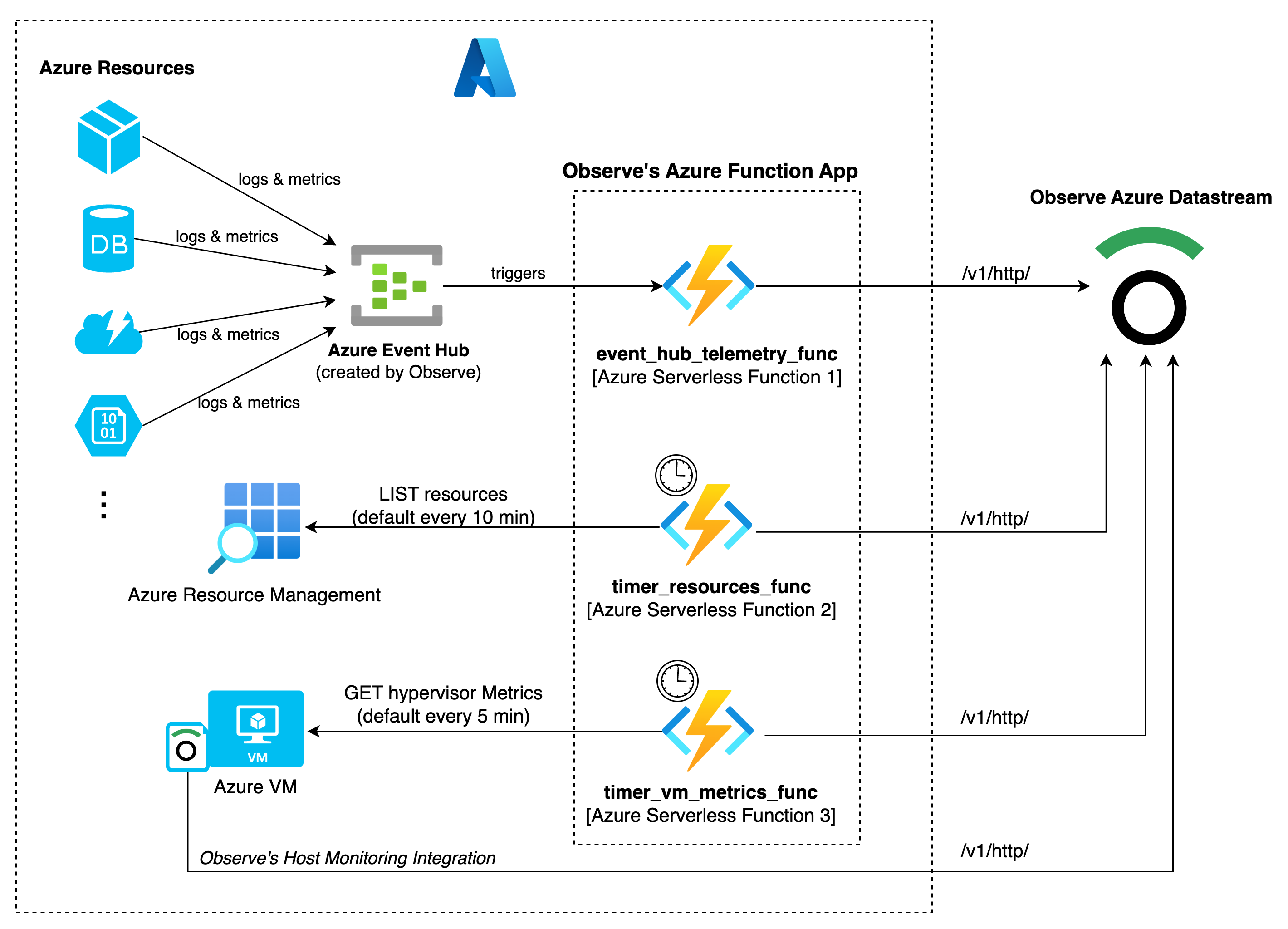 event_hub_telemetry_func- captures the data sent to the Event Hub from the Azure resources Diagnostic settings. Event Hub triggers this function and forwards the data to Observe. -