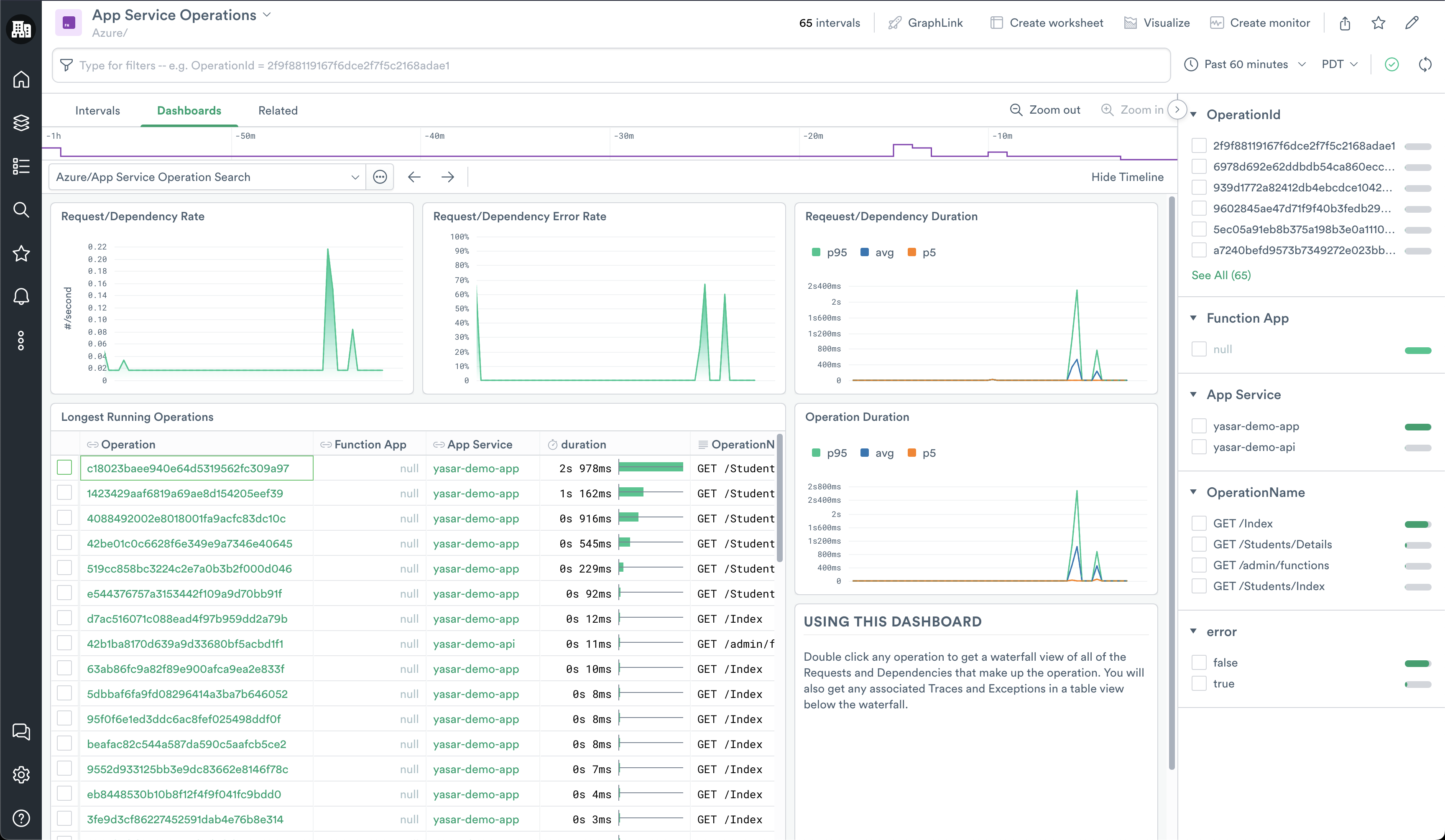 The Azure App Service Operations Search dashboard provides insights into operations for the Azure Function app. From here, you can collect answers to the following questions: