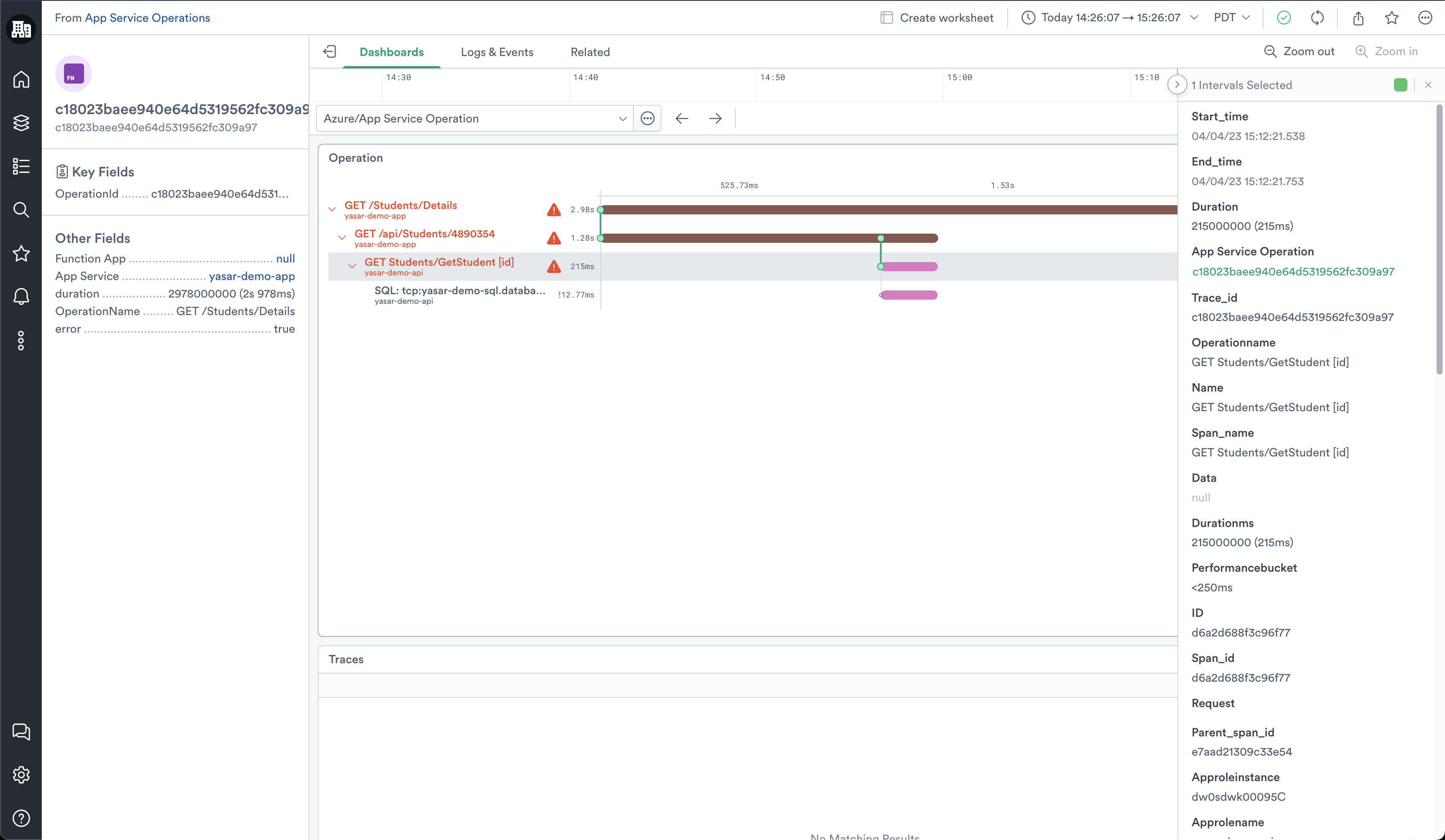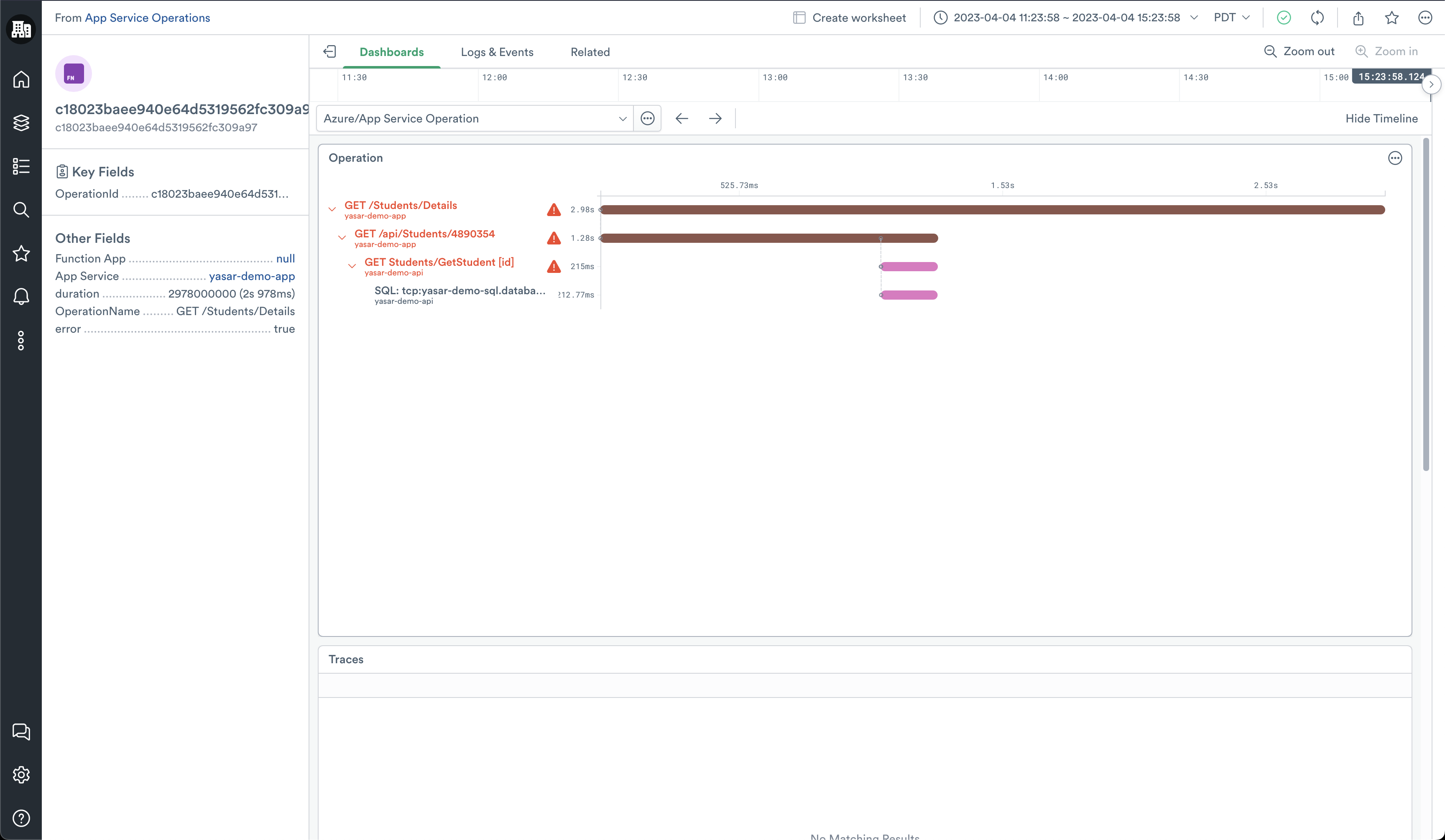 If you find a request you want to explore further, you can double-click the Azure App Service Operation ID from the table and go to the detailed view of the operation. It provides you with a Gantt view of all of the requests or dependencies that make up the operation as well as any associated events and traces.