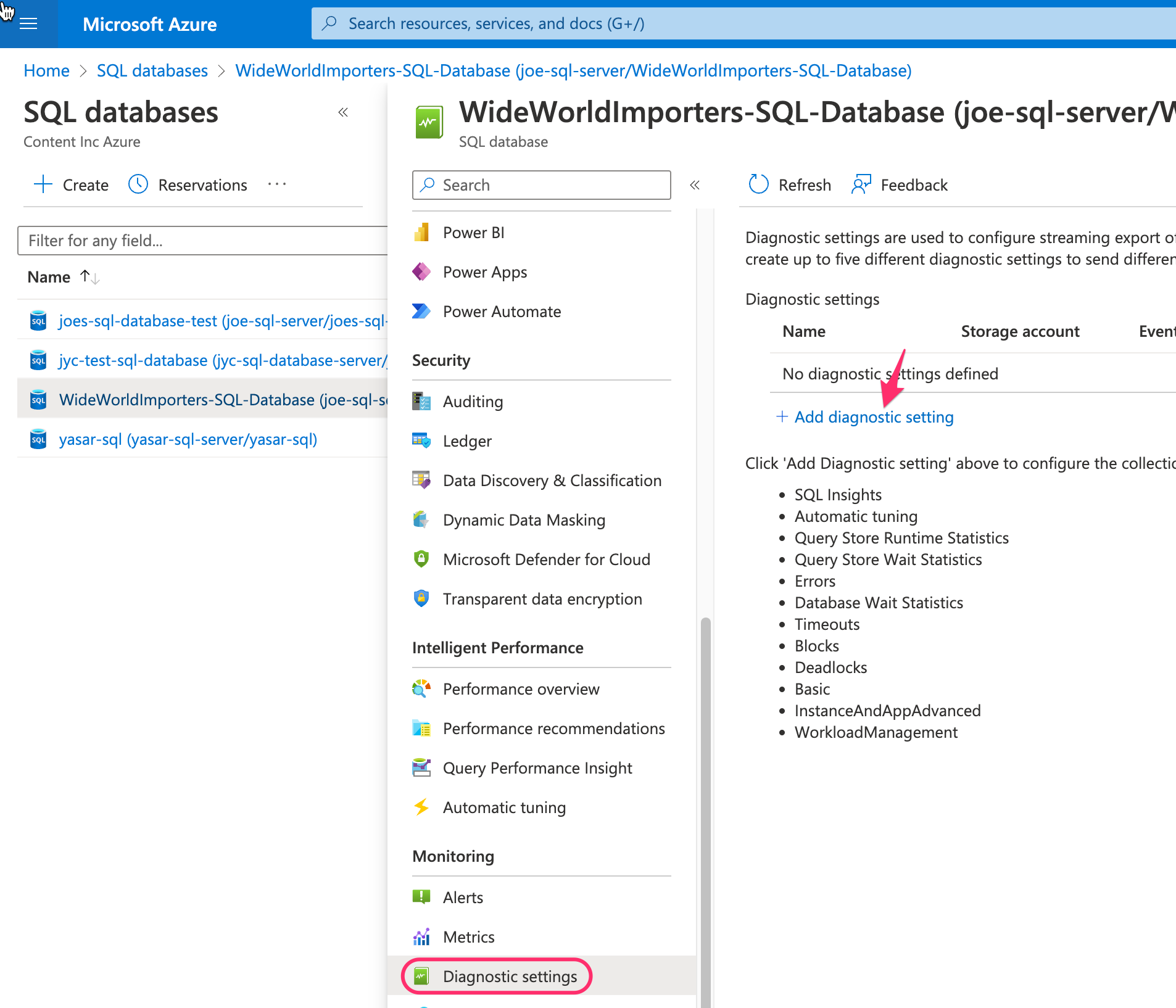 - From the left menu, choose Diagnostic Settings and click Add diagnostic setting.