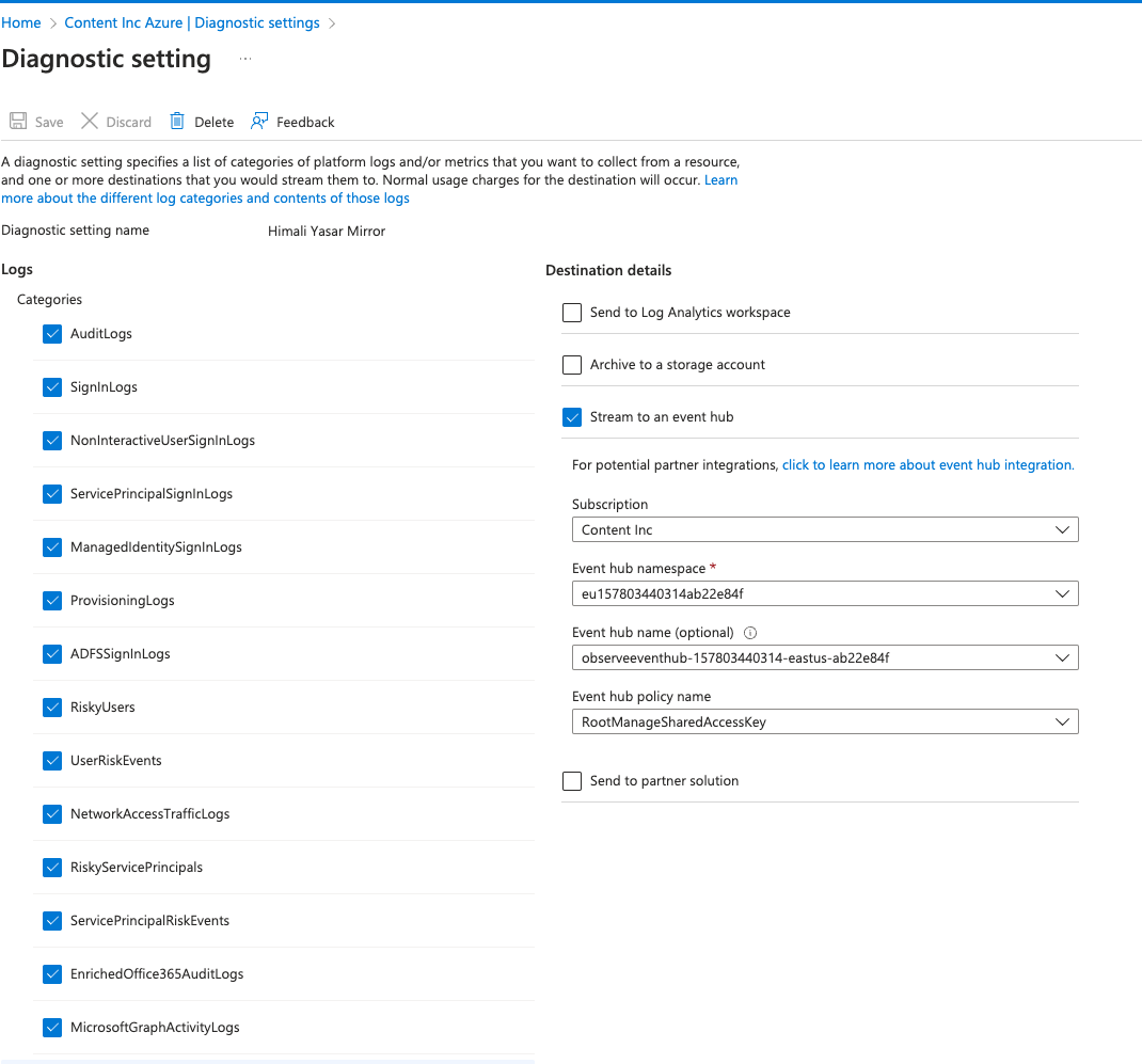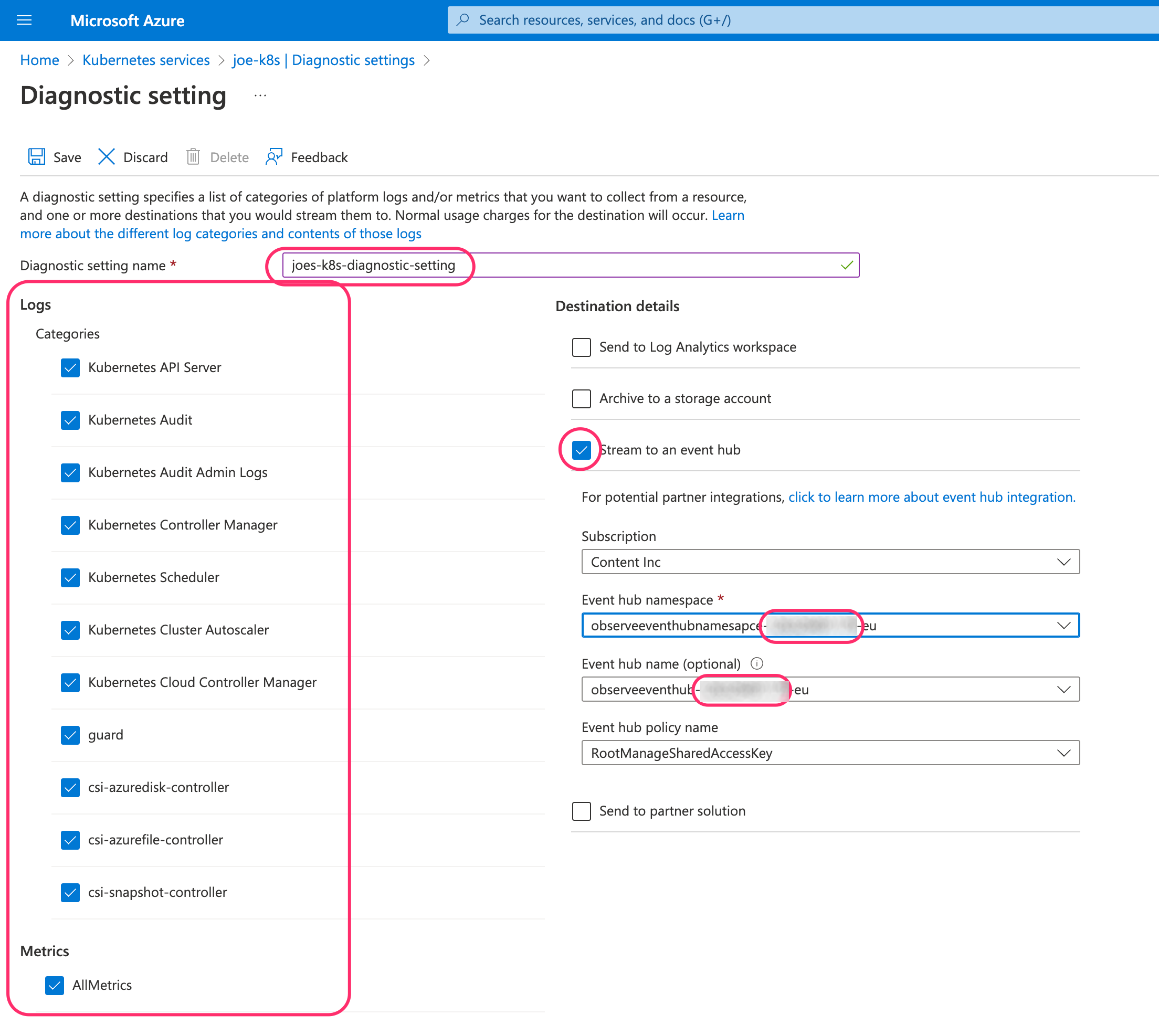 - Select all Logs, Audit logs, and all Metrics. Send to event hub with your customer-id.
