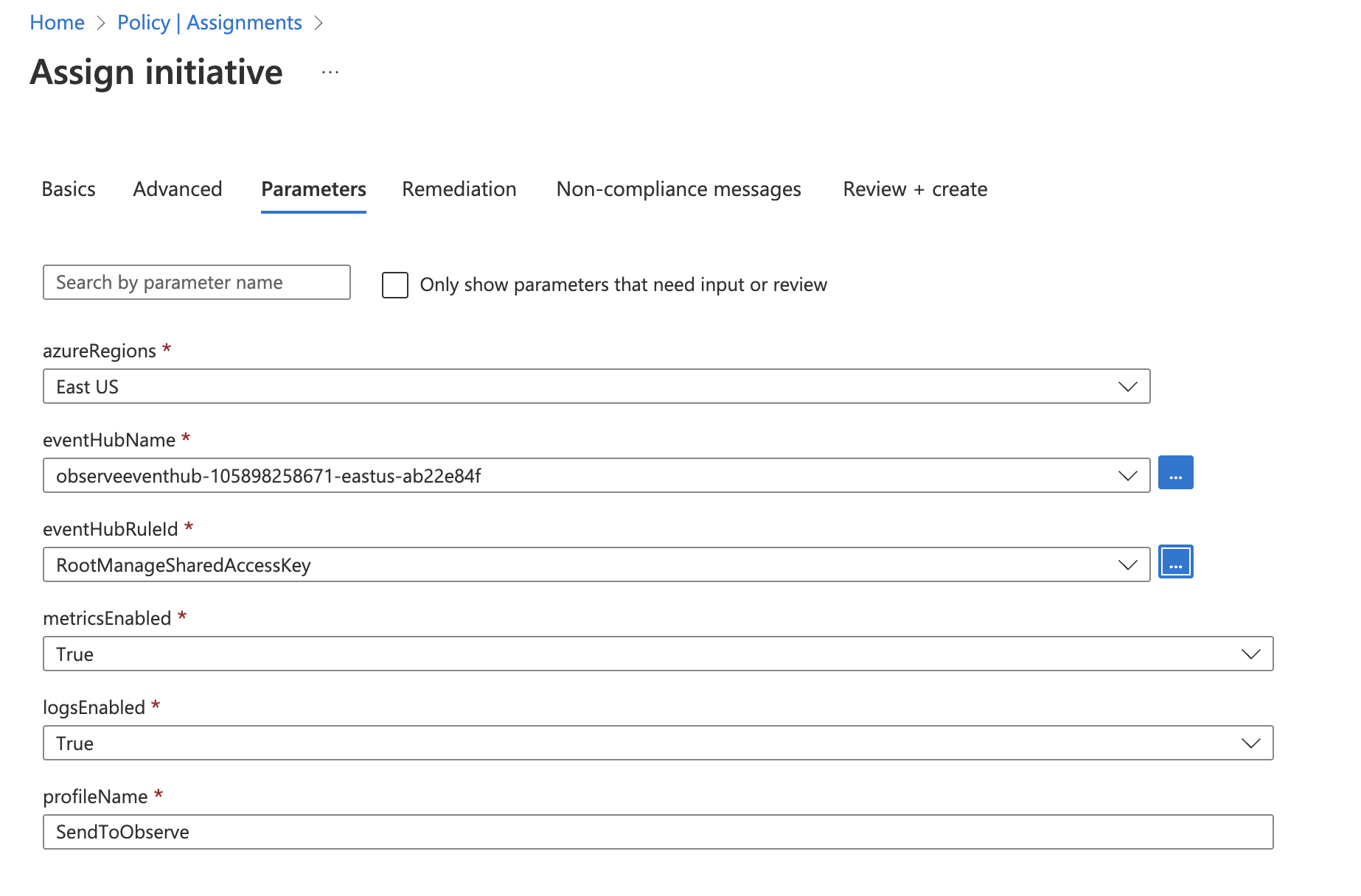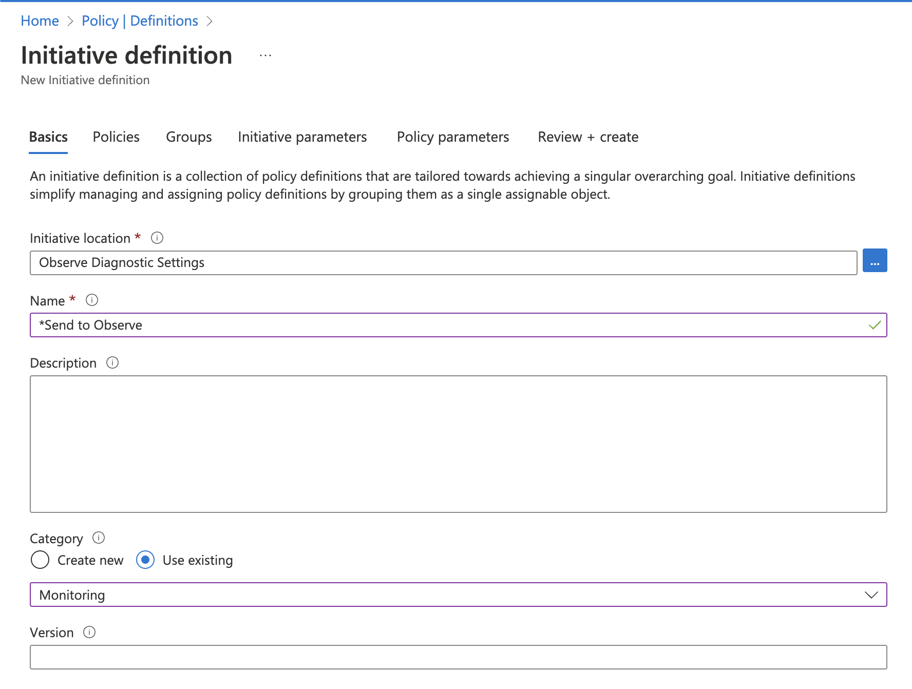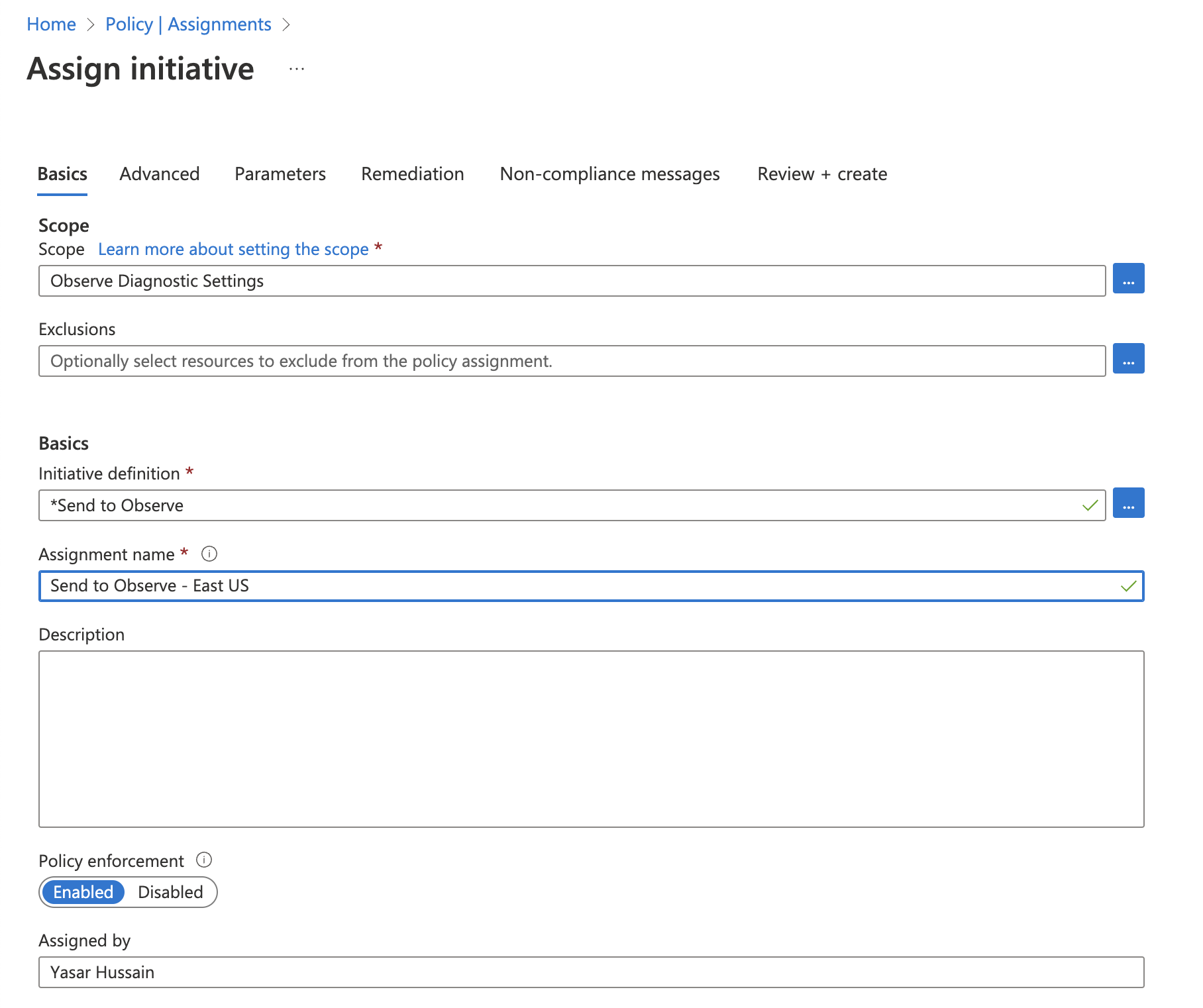 Once you create the policies in your Azure account, Observe recommends creating a policy initiative, assigning the relevant policies, assigning that policy to a Management Group, and then adding your subscriptions to that management group.