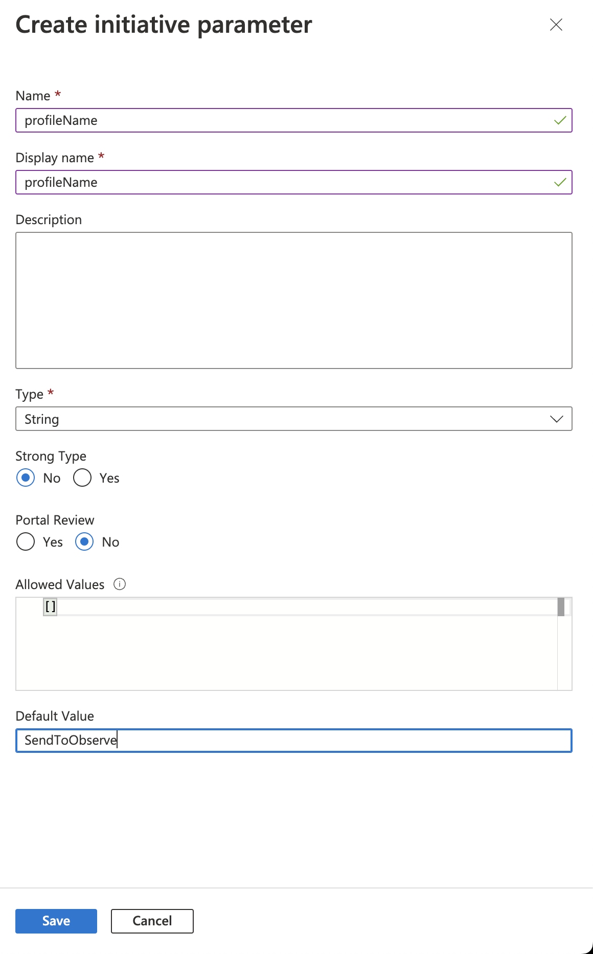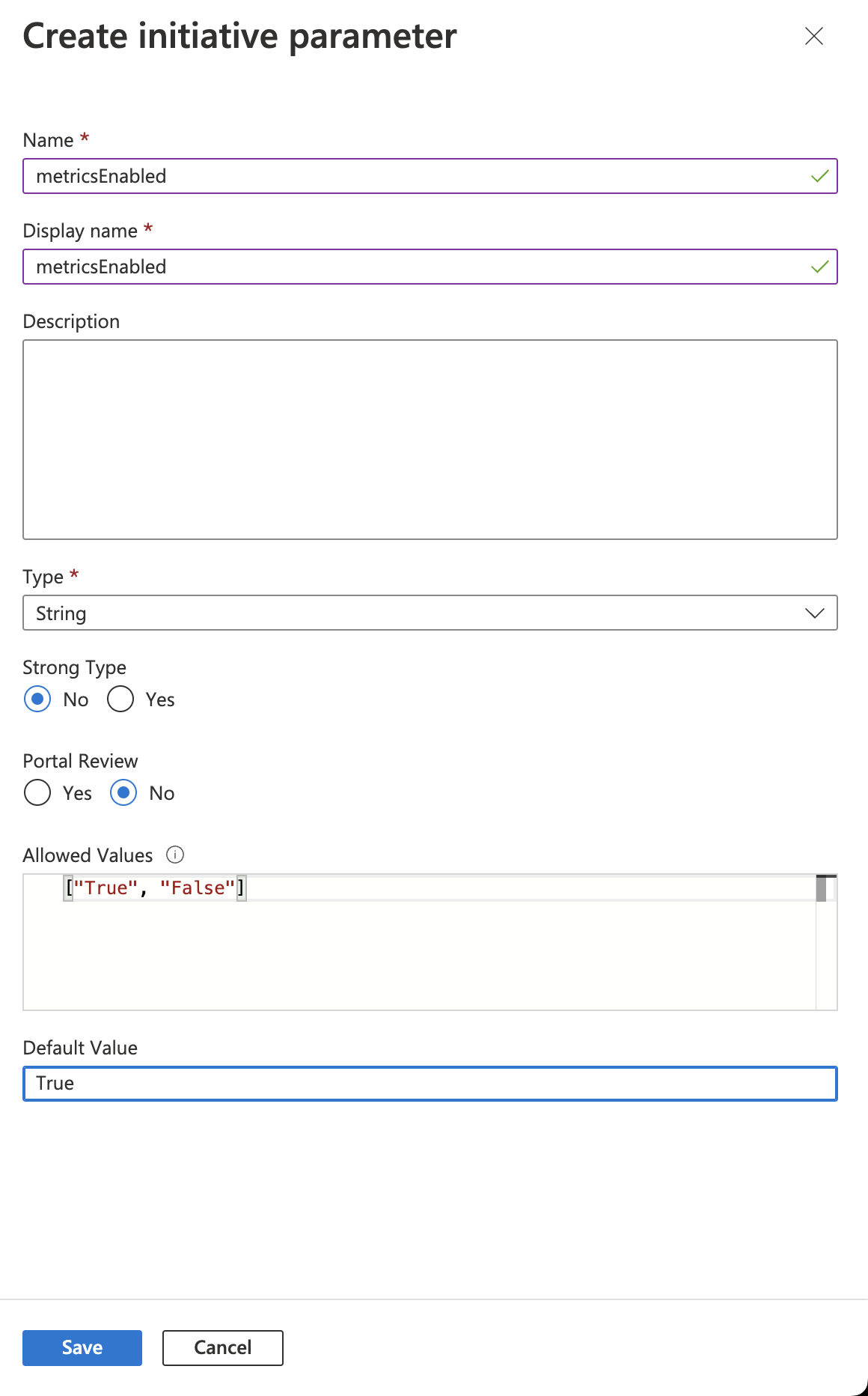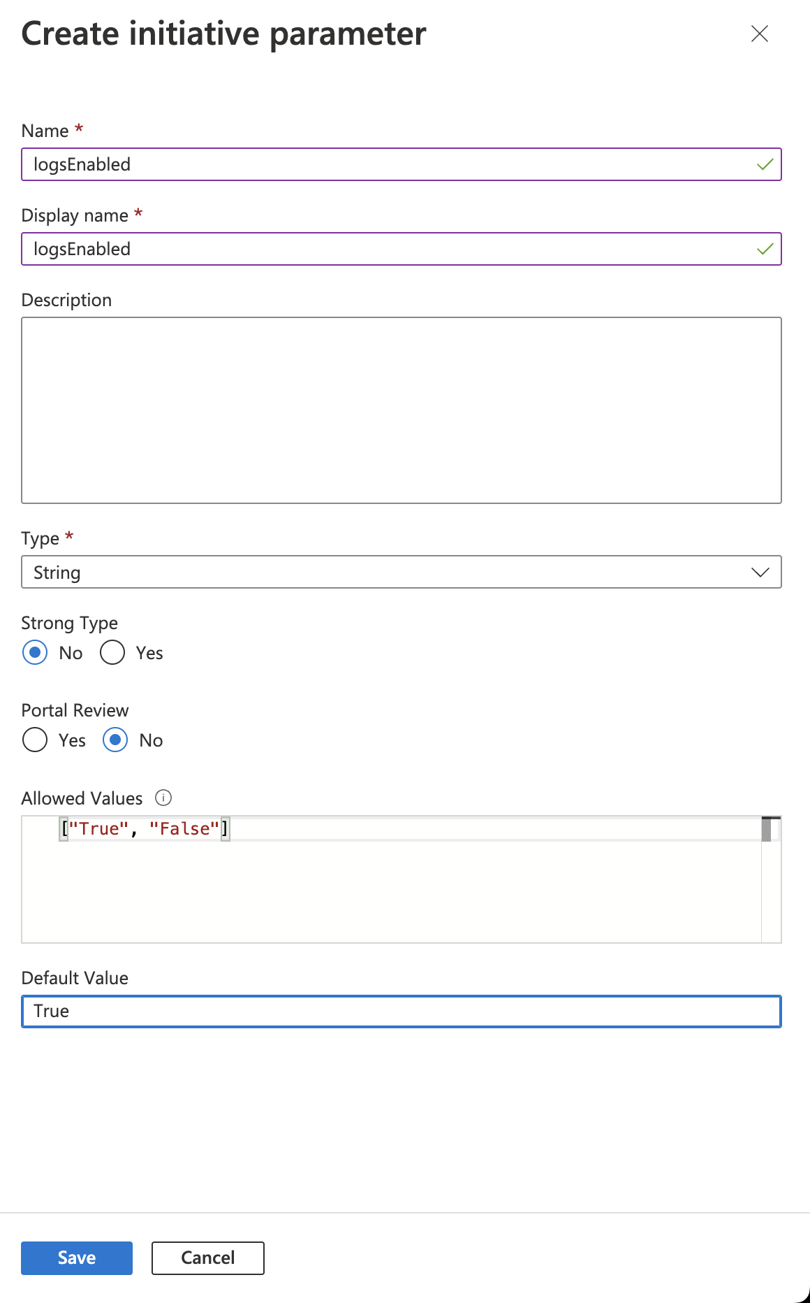 - Create an initiative parameter called logsEnabled. Set the type to string, and set the allowed value to ["True", "False"].