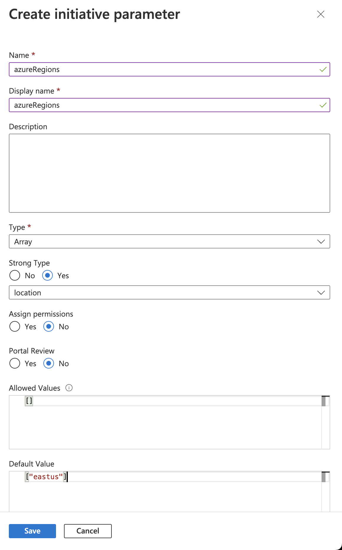 - Create an initiative parameter called azureRegions. Set the type to array, and add a strong type of location. Add a default value, and then click Save.