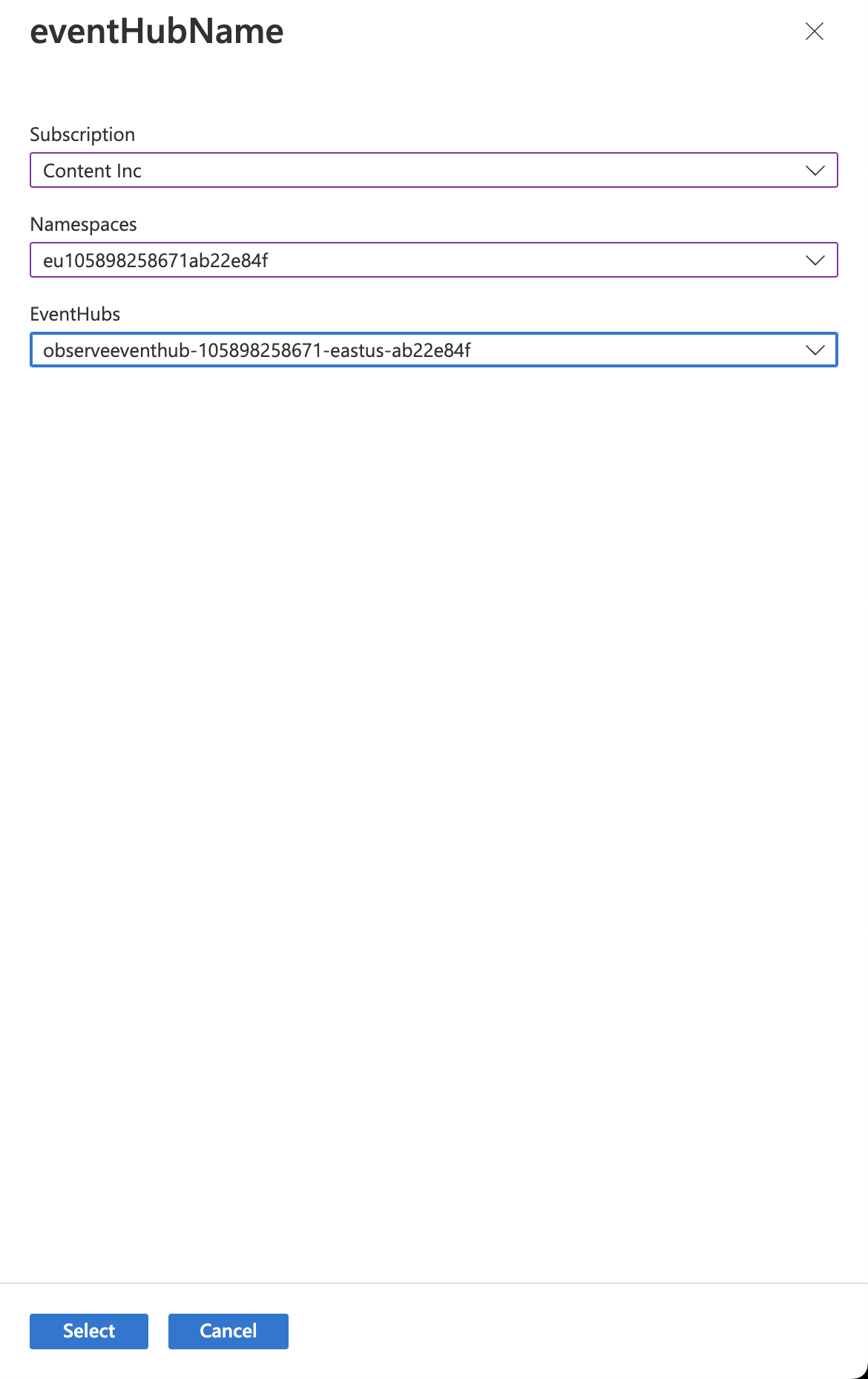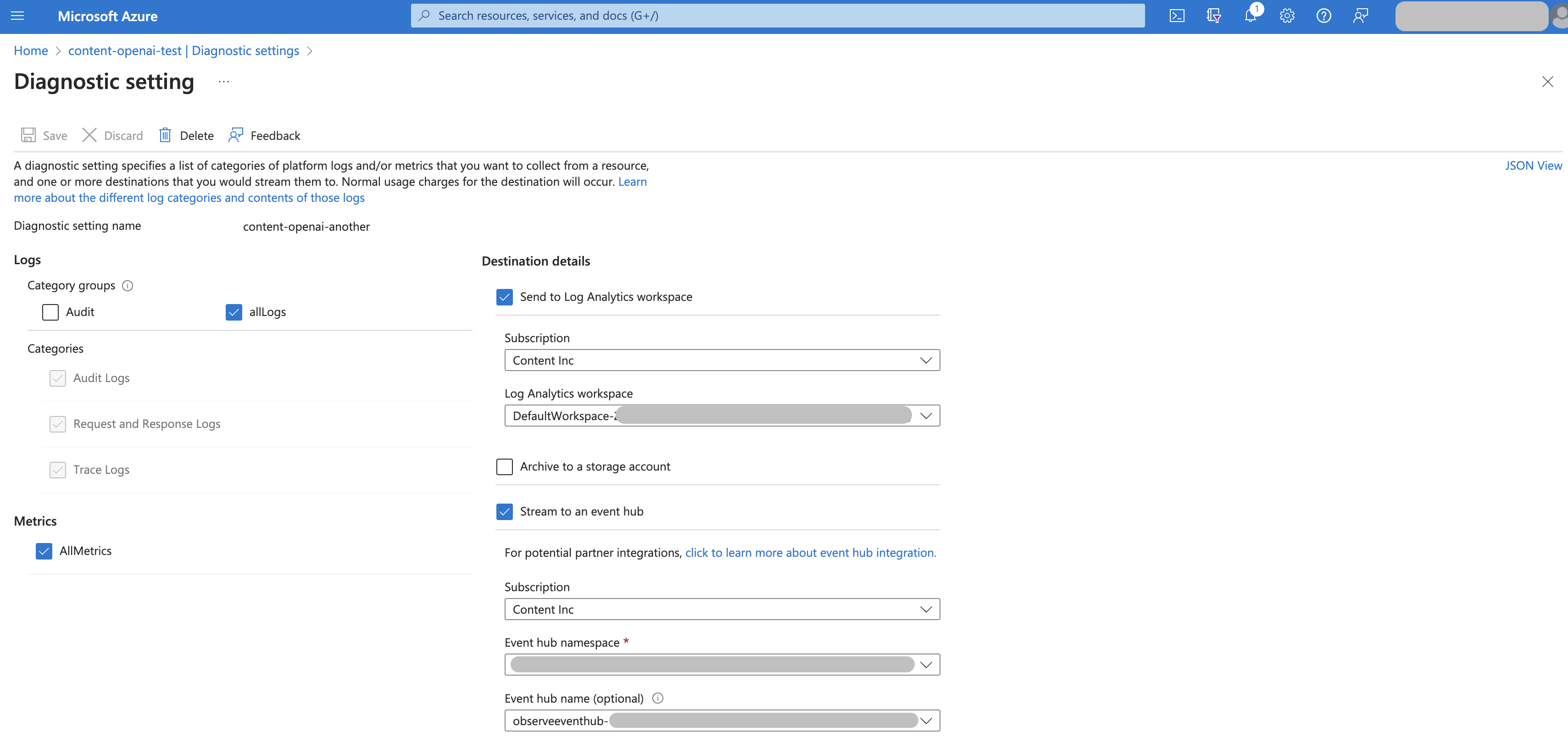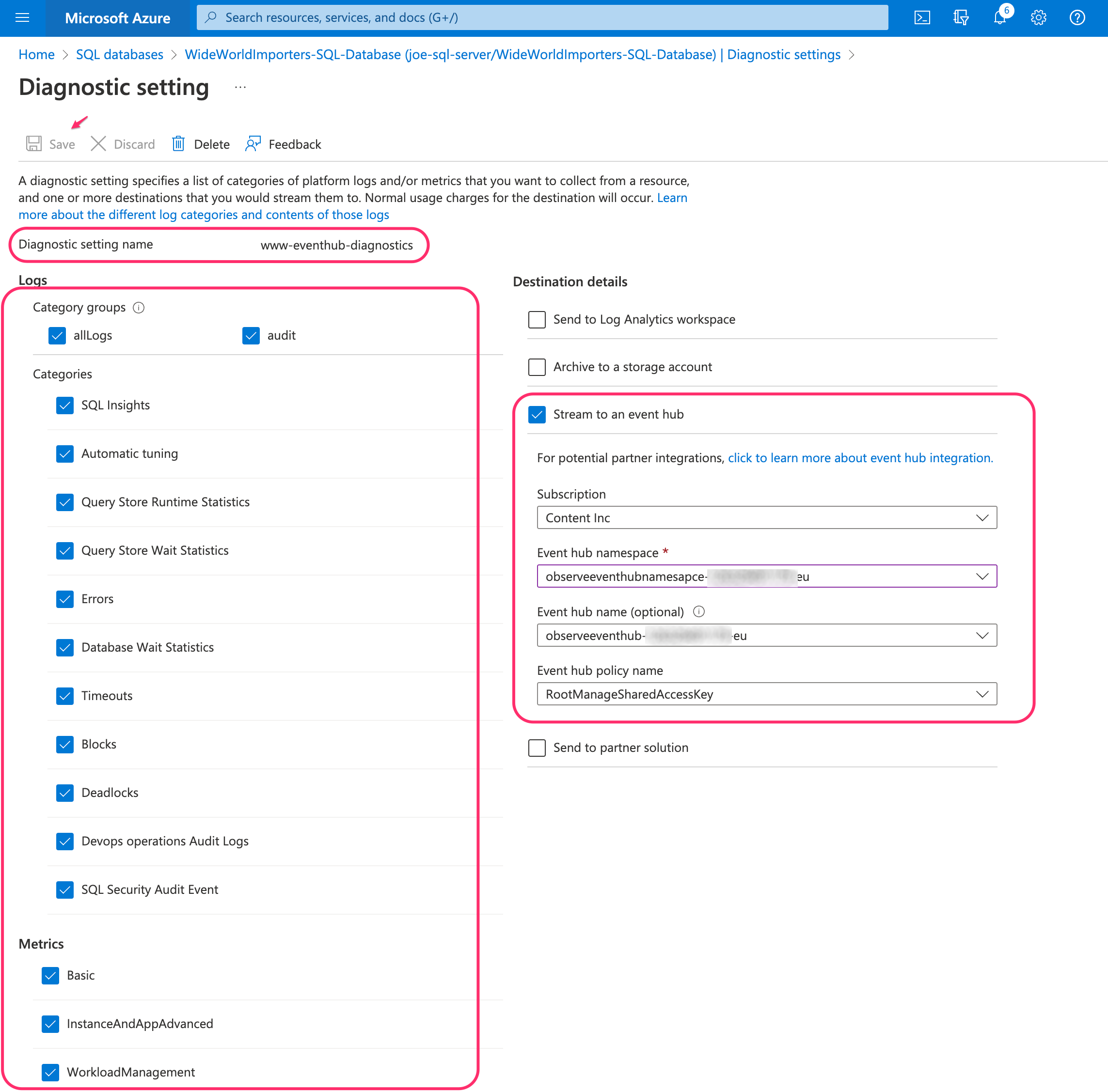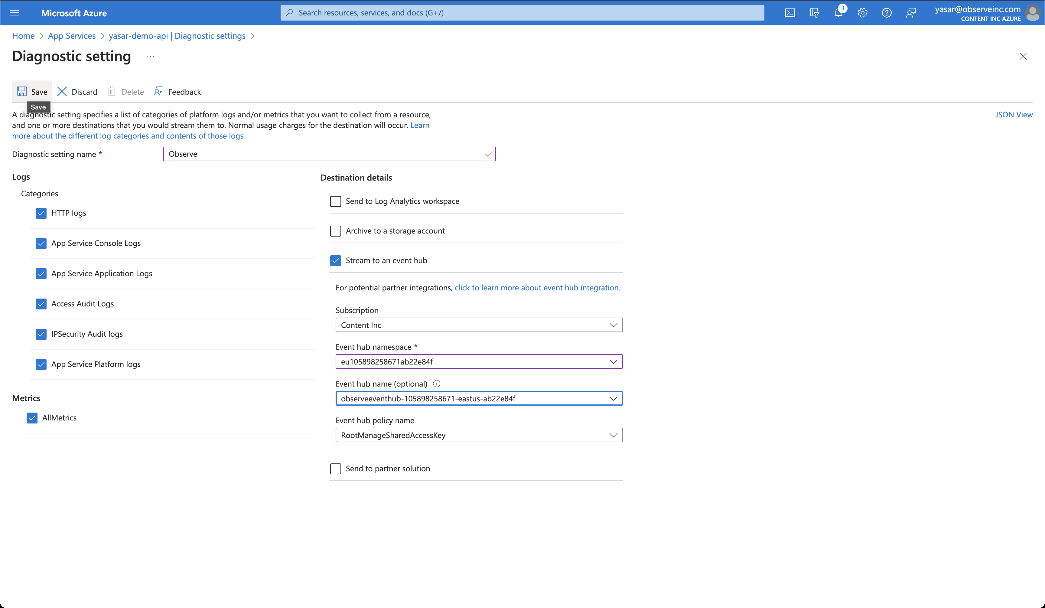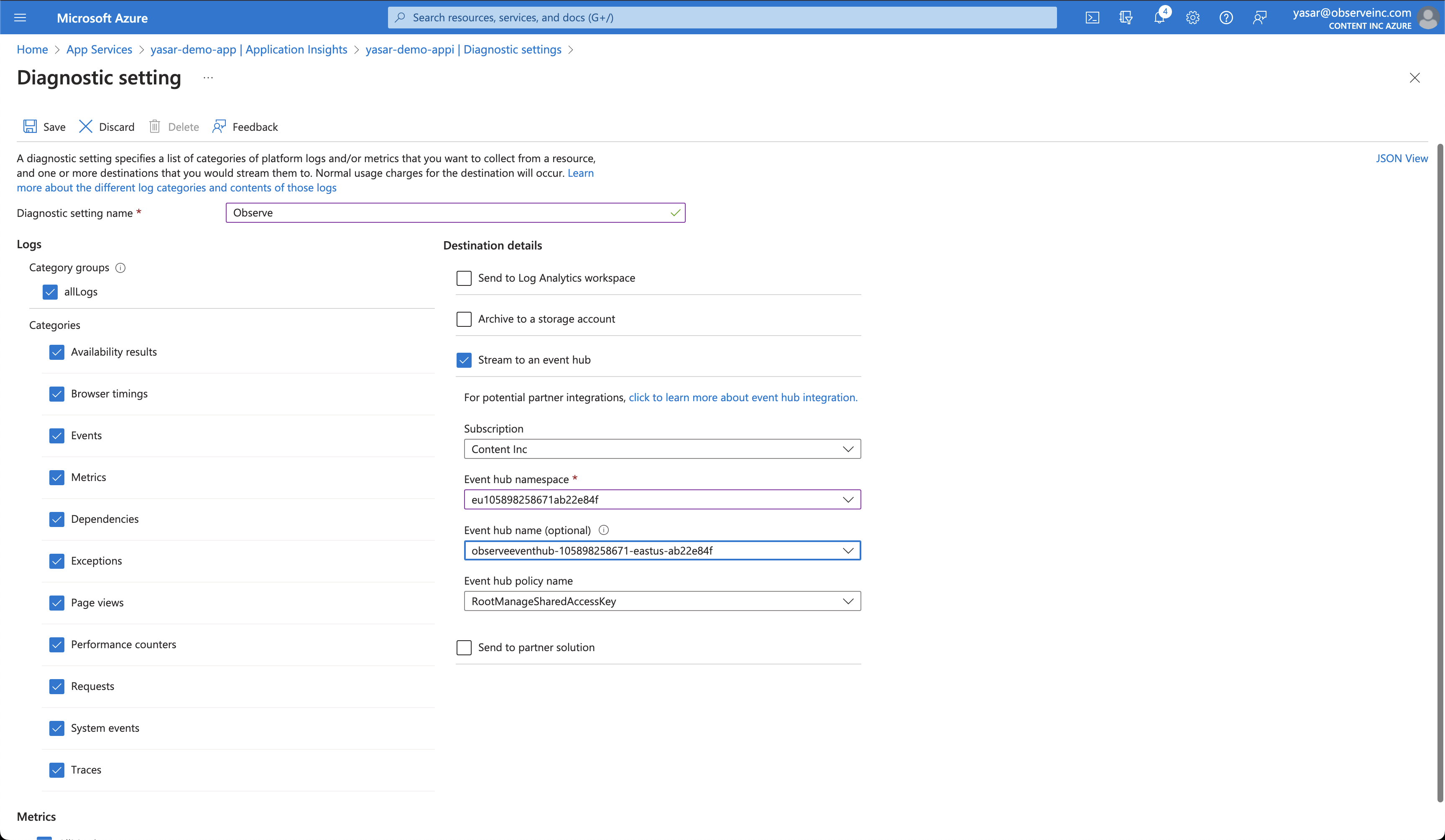 - Create a name for your setting. Select all of the metrics listed, then click Stream to an Event hub. Be sure to select the Event hub namespace and Event hub name with your Observe customer ID.