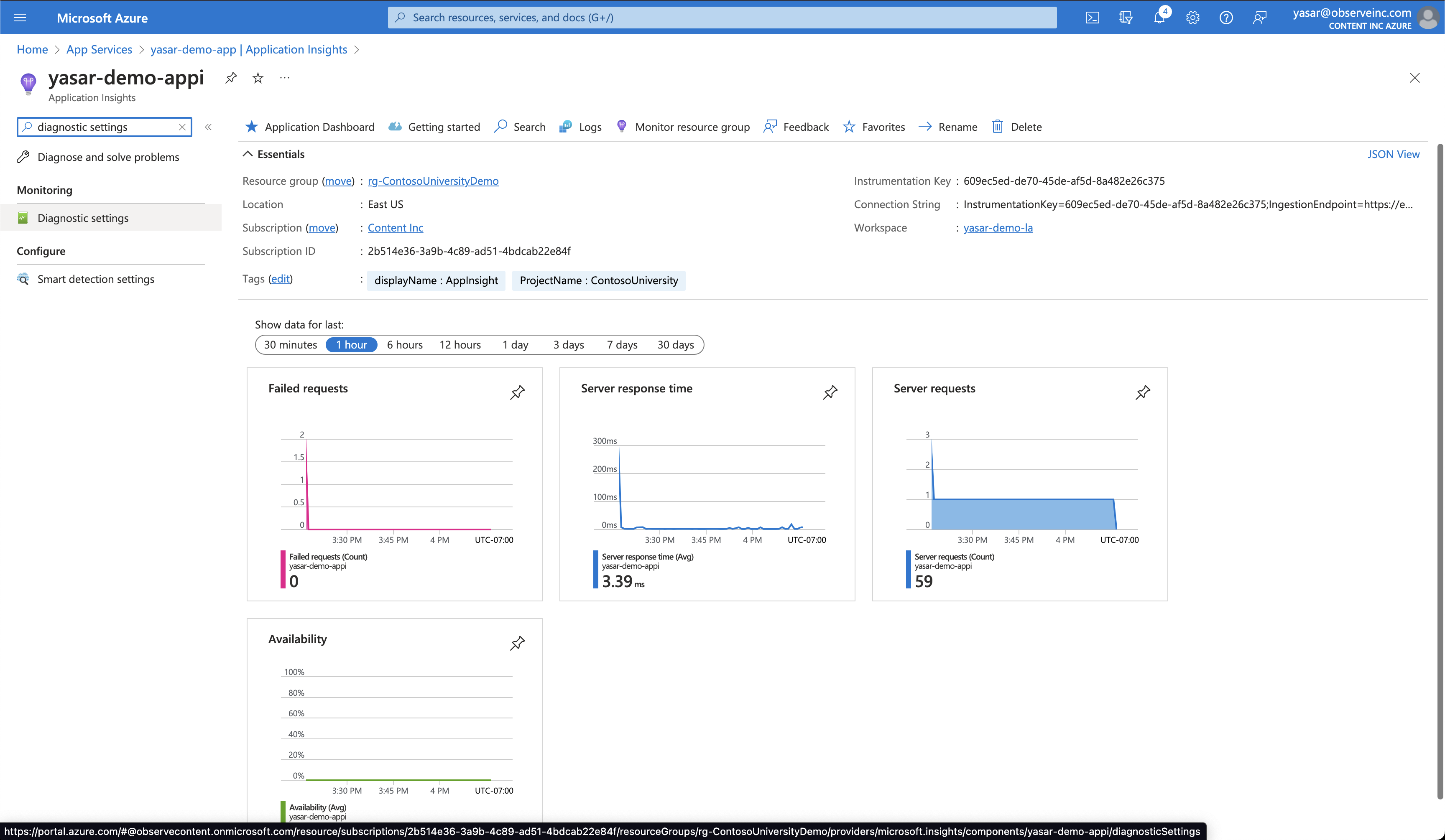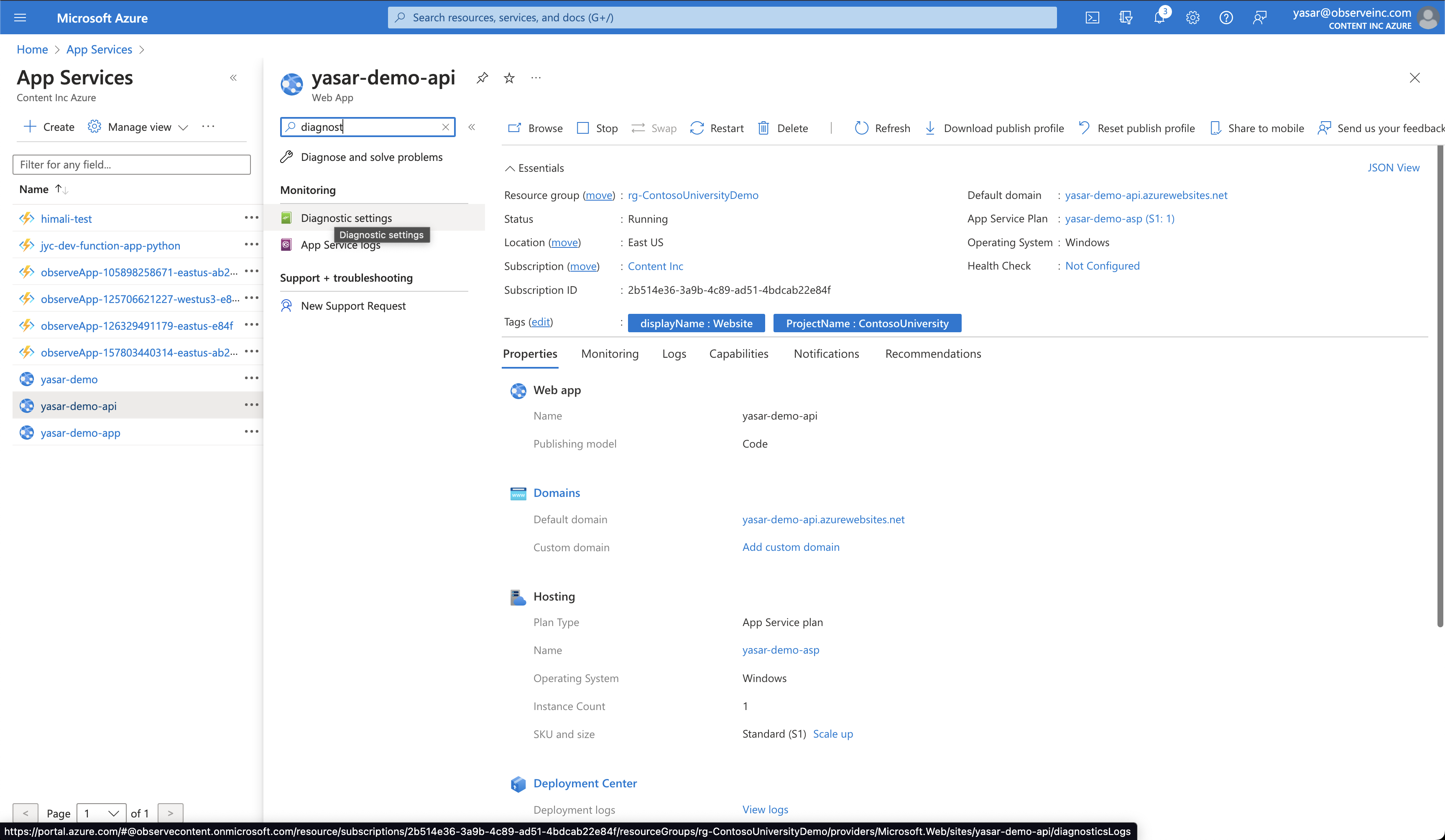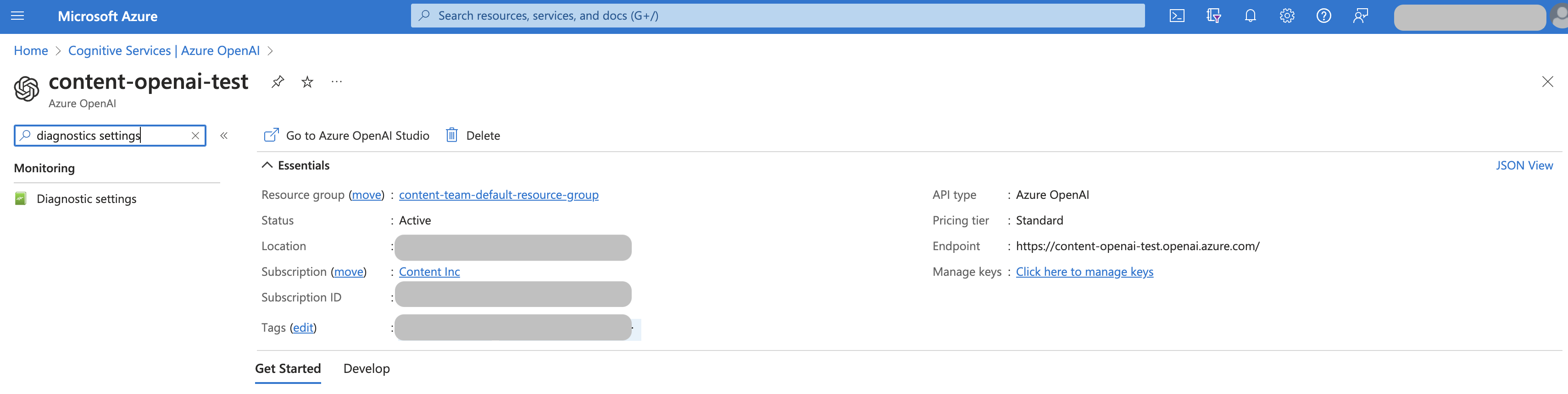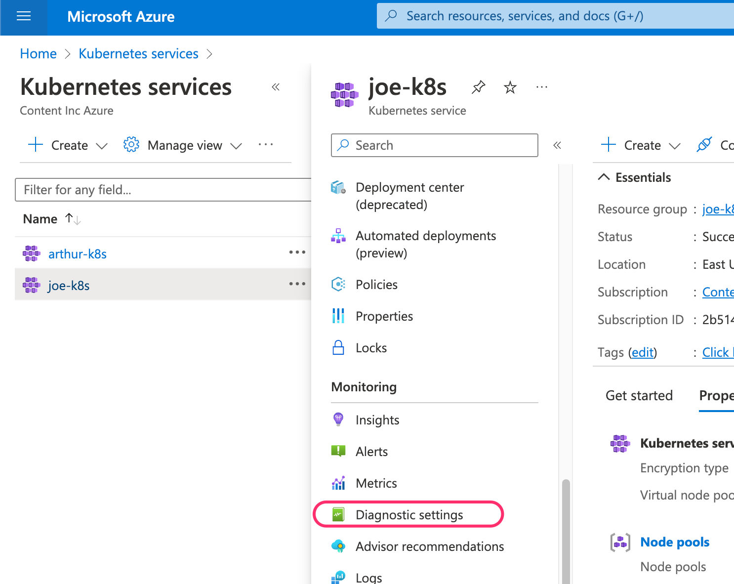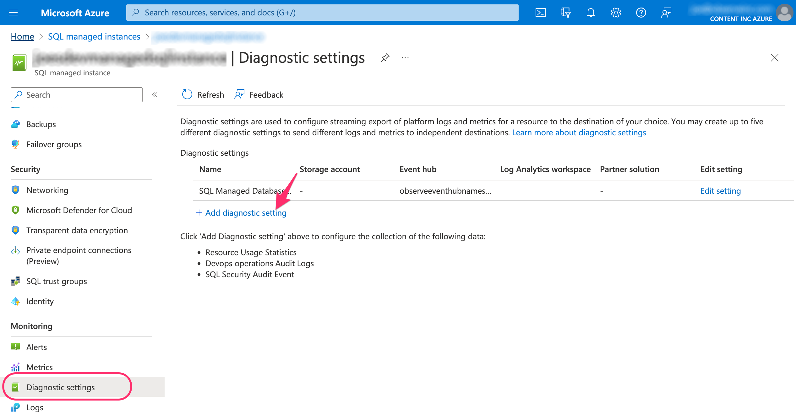 - Go to Monitoring and Diagnostic settings. Select Diagnostic setting.