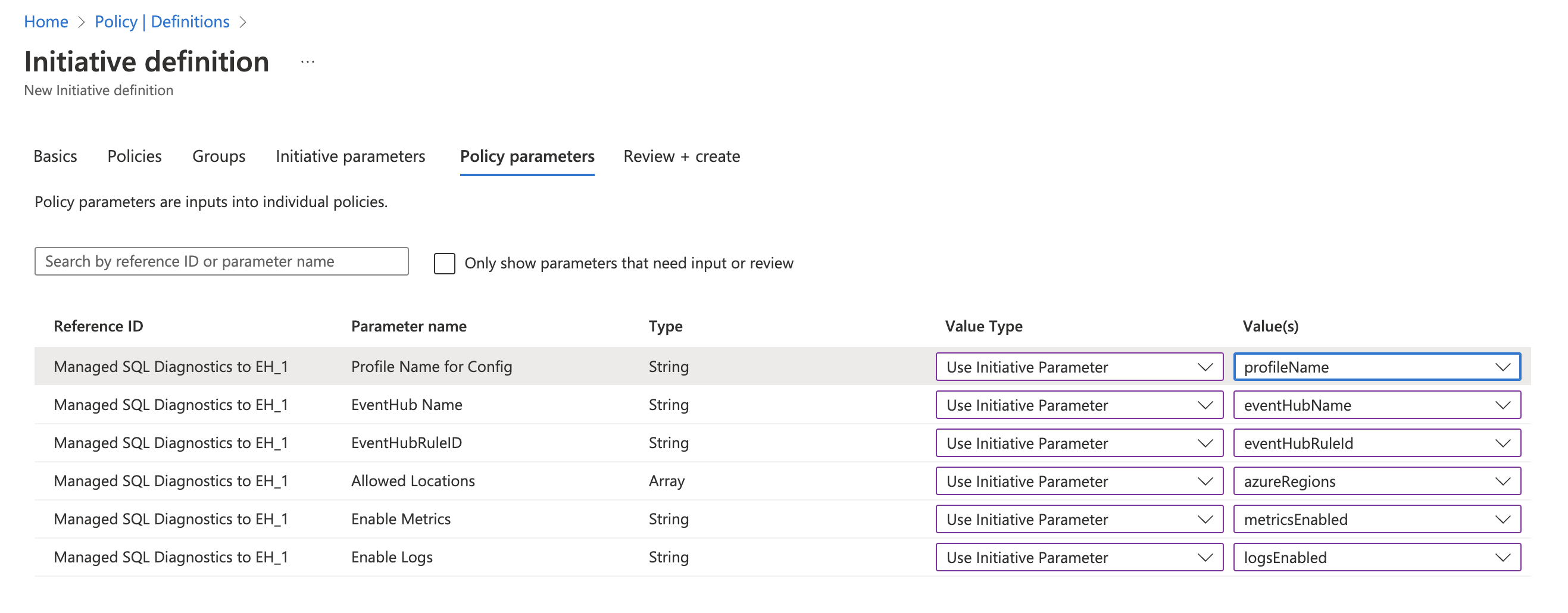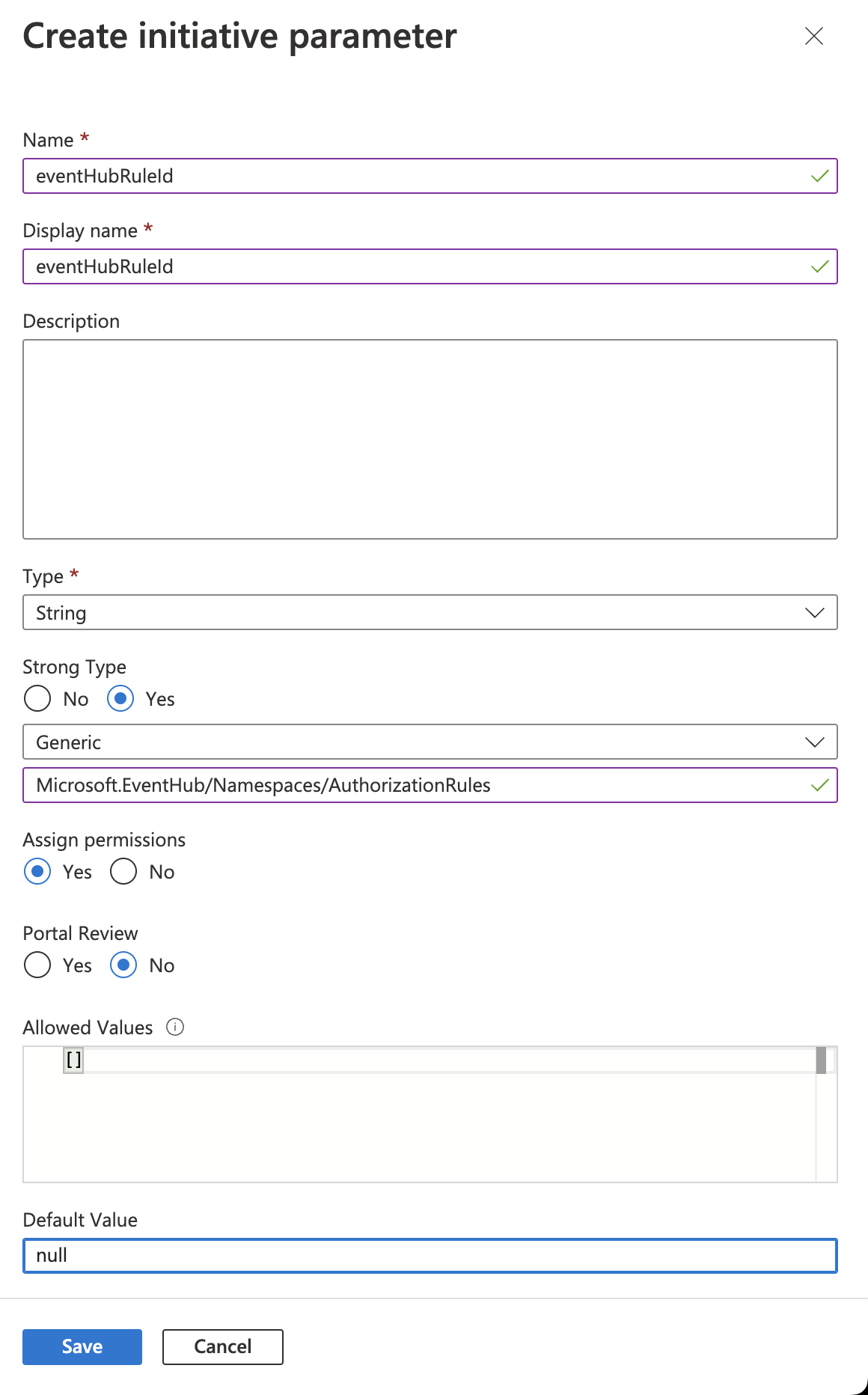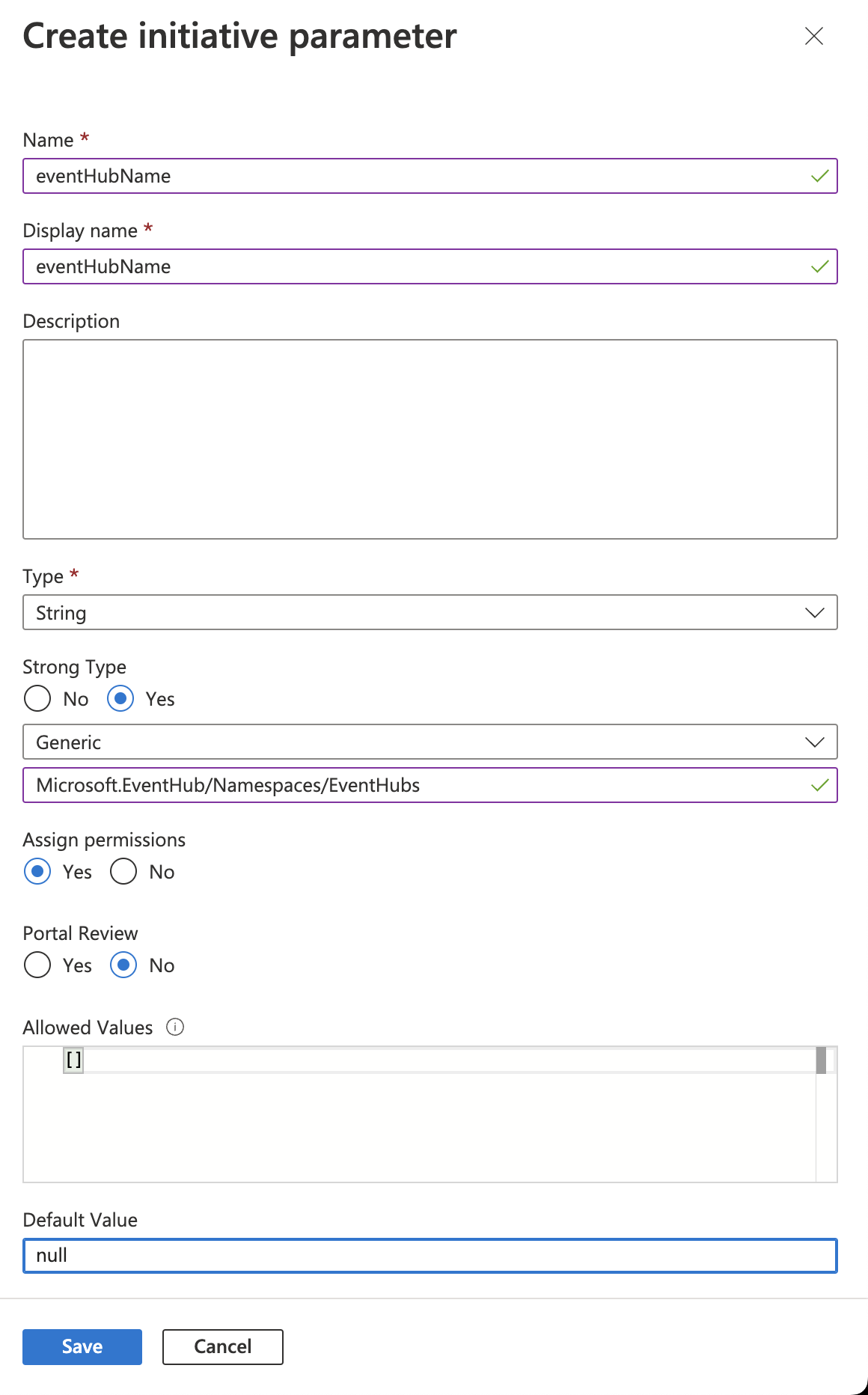- Create an initiative parameter called eventHubName. Set the type to string, and give it a strong type of Generic - Microsoft.EventHub/Namespaces/EventHubs.