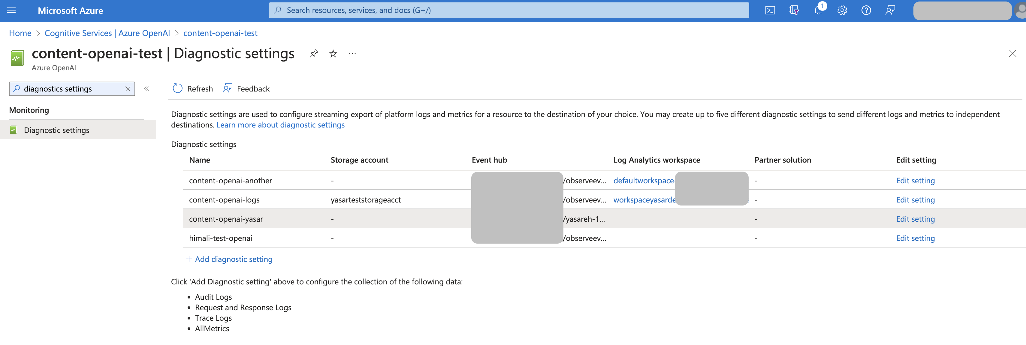 To capture logs and metrics of most resources, you must add diagnostic settings. Click on the desired Azure service name for instructions on adding diagnostic settings.