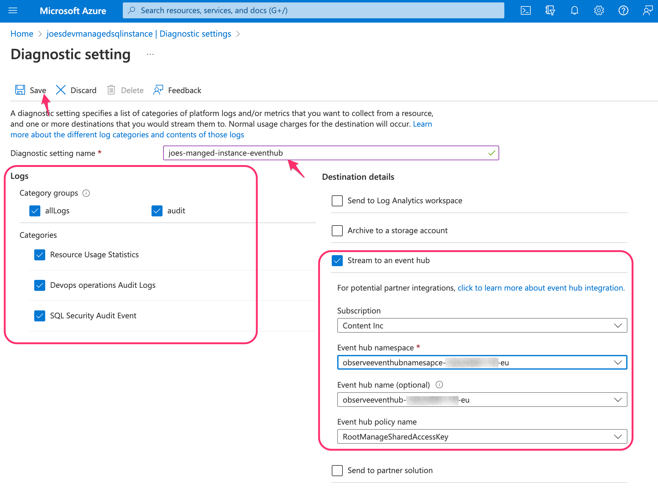 - Choose all Logs, Audit Logs, and all Metrics. Send to the event hub with your customer ID.