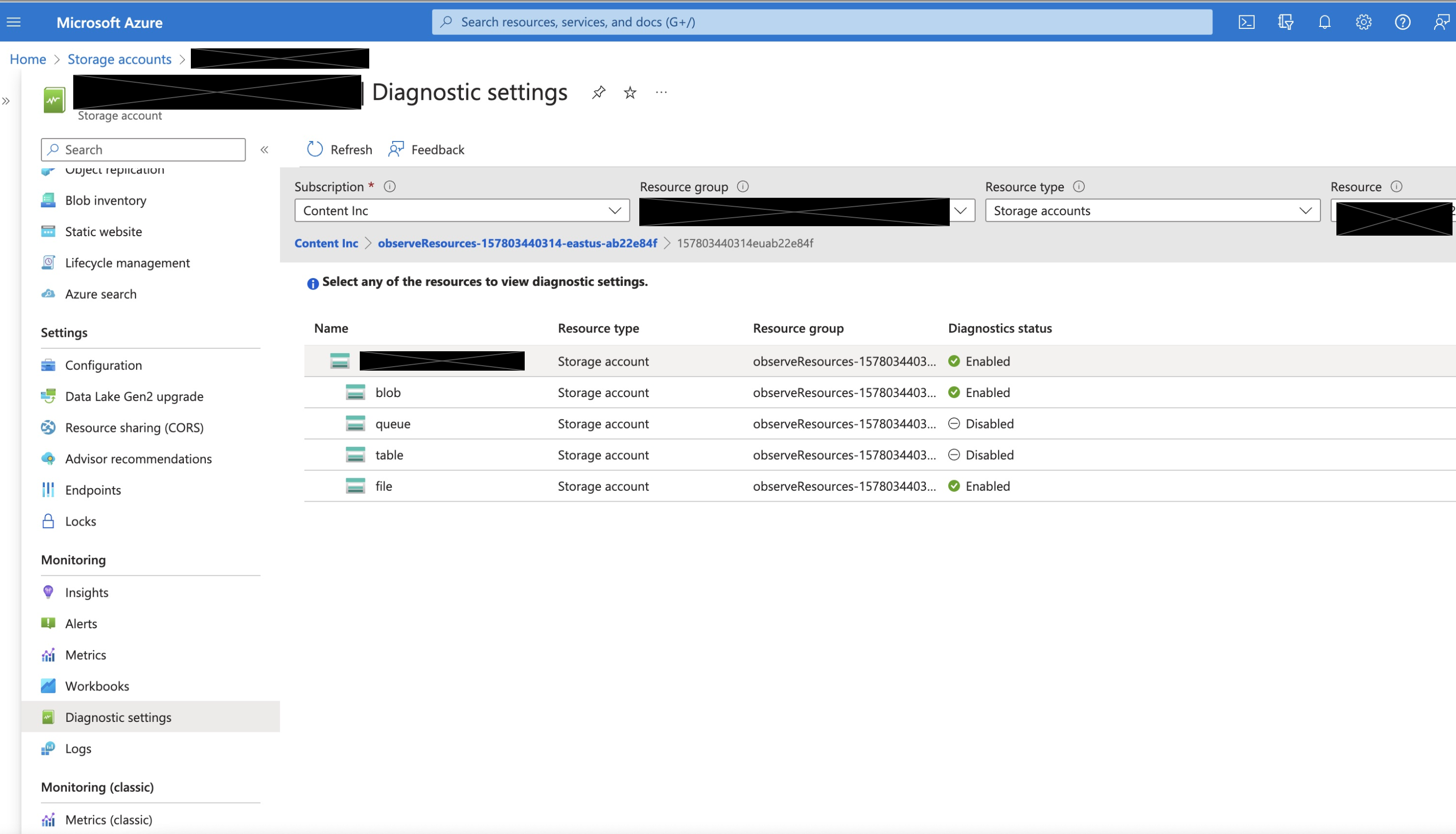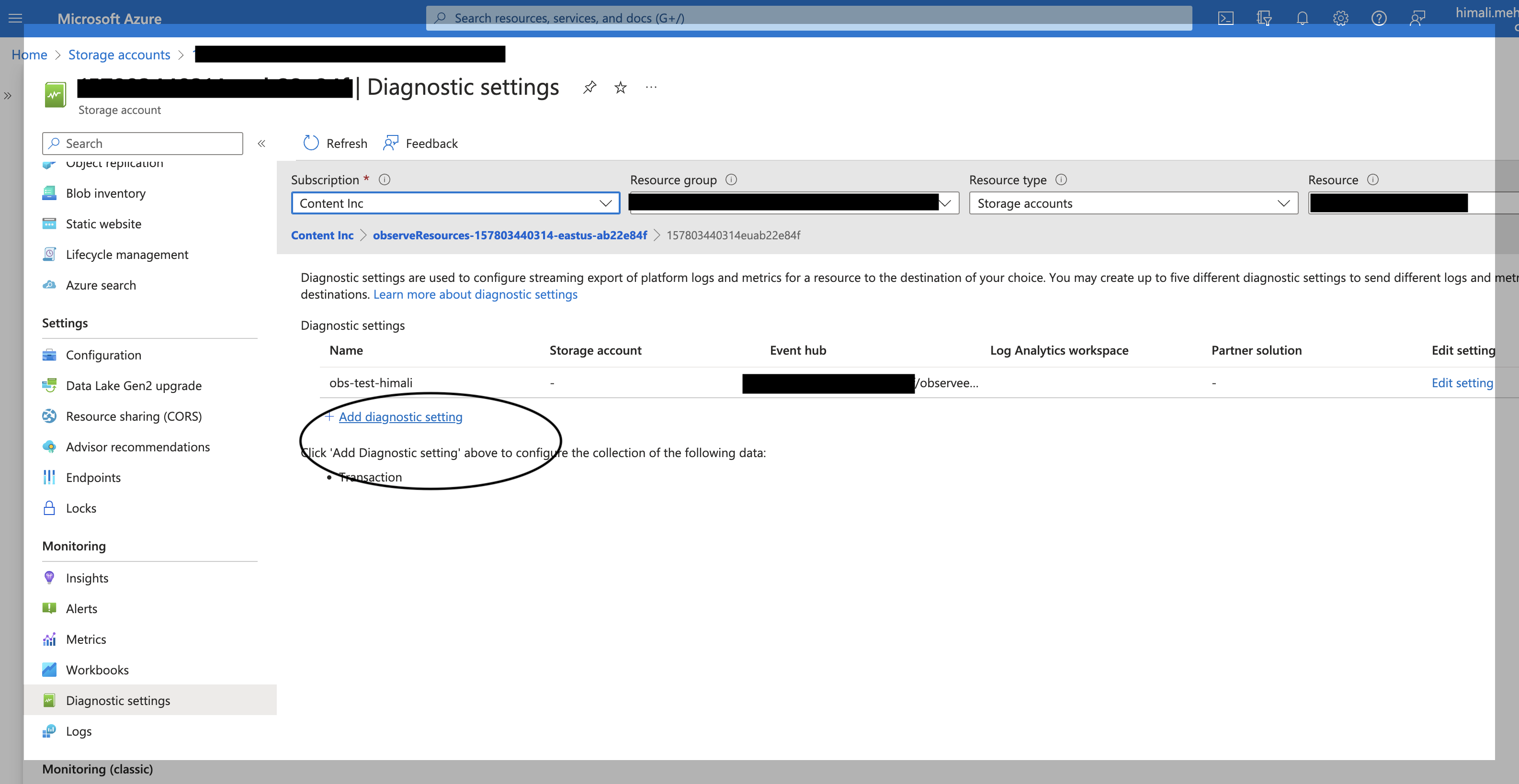 - Go to the Monitoring section and select Diagnostic setting. This enables logs and metrics at the Storage Account level.