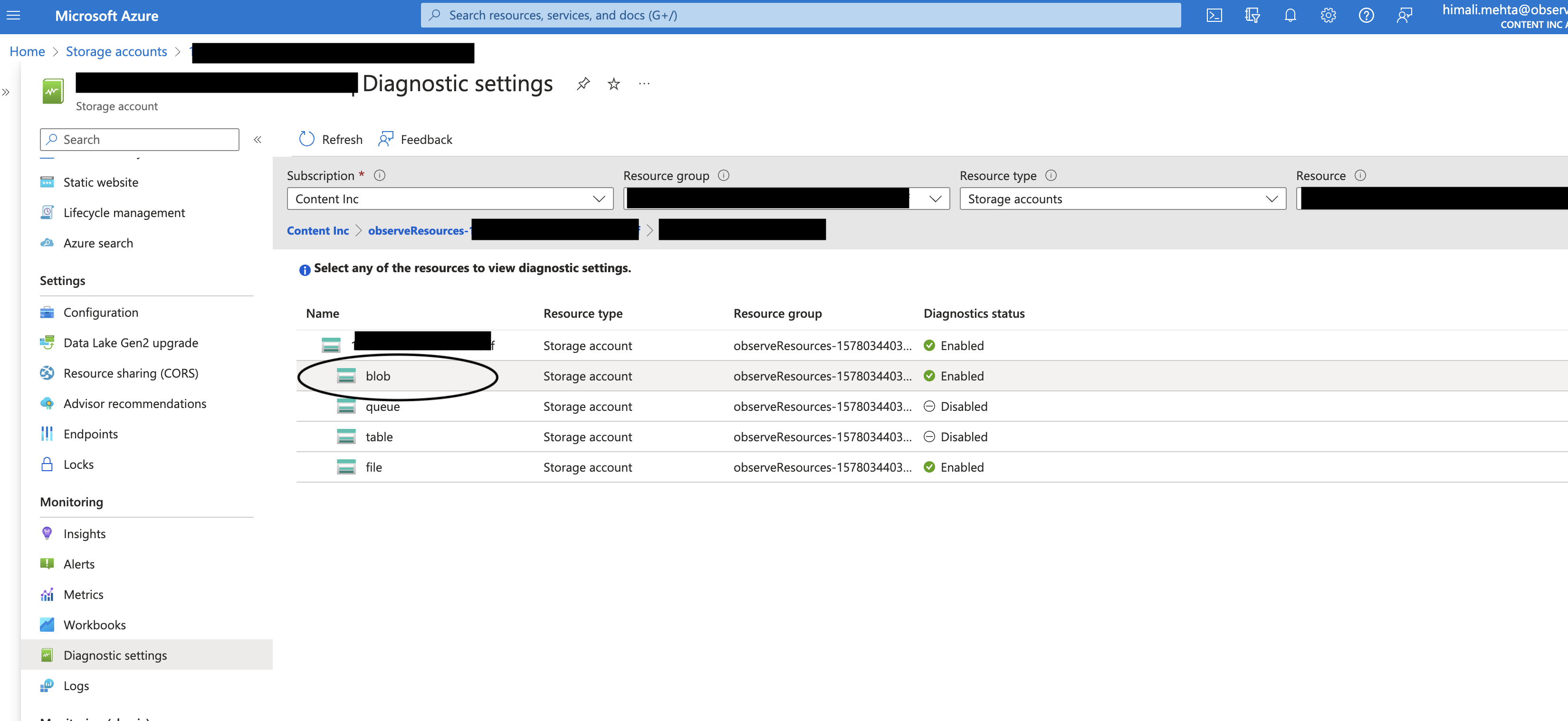 - Go to the Monitoring and Diagnostic settings. Select Diagnostic setting. Select blob under the Storage Account.