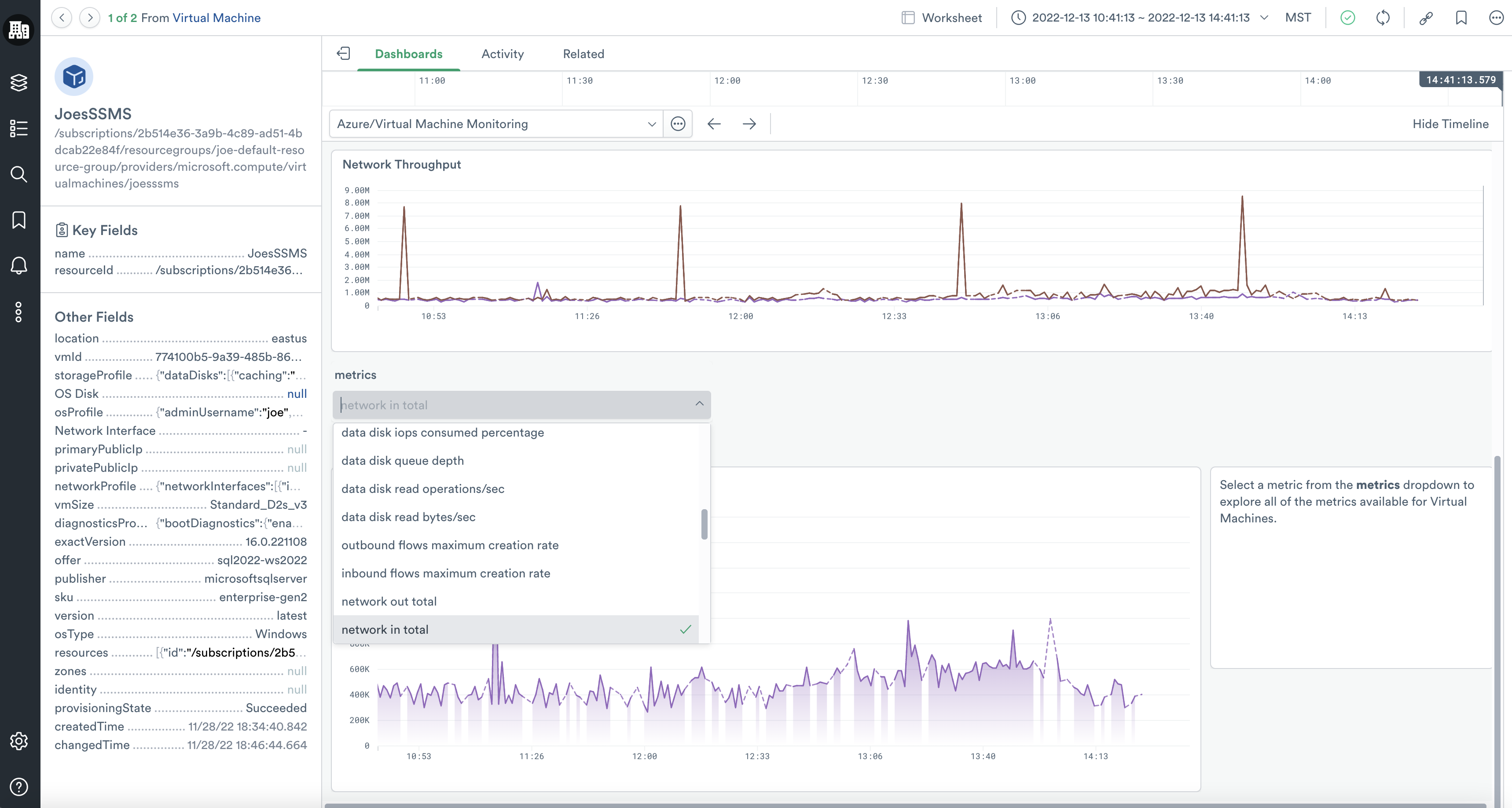 - Virtual Machine Instance dashboard also includes a Metrics Explorer, which allows you to plot any metric Azure generates for a given Virtual Machine over time.