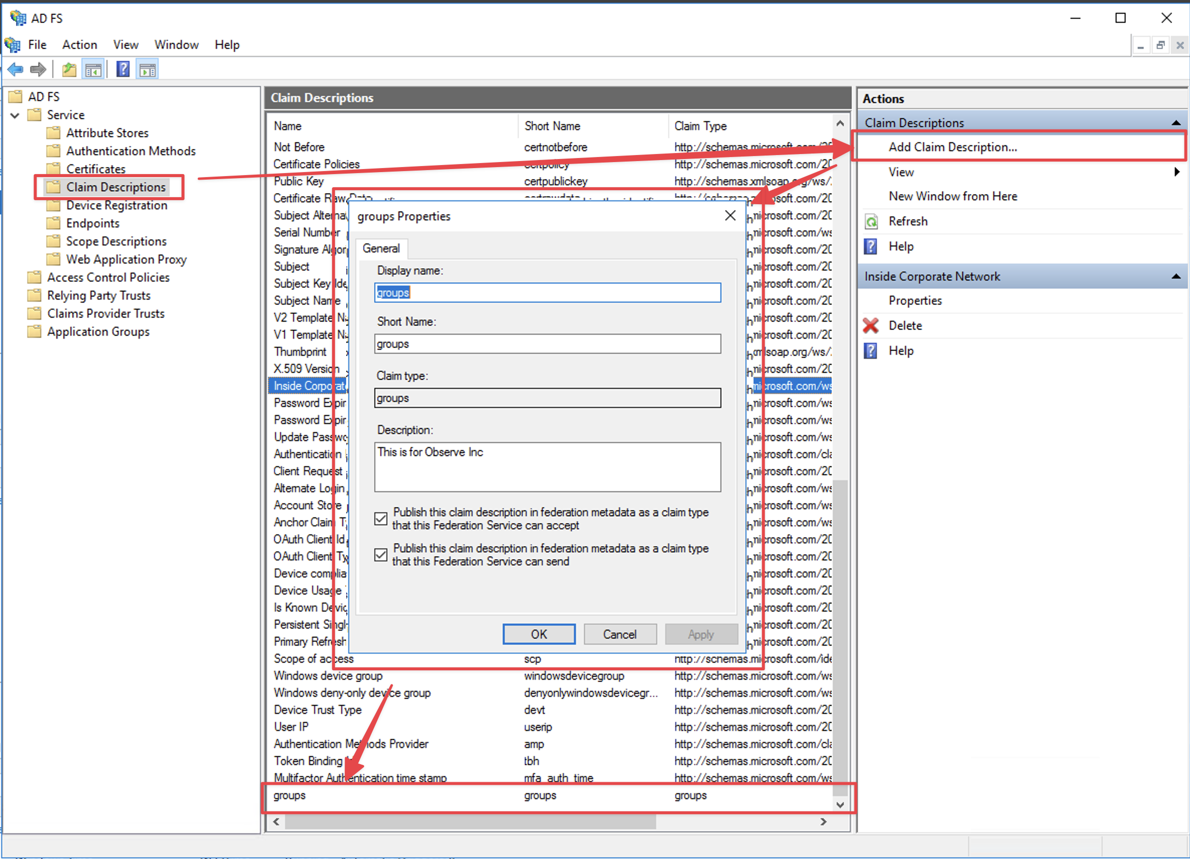 groups. To add this claim description, navigate to theClaim Descriptionsarea of the ADFS Console and selectAdd Claim Description. Set the values forDisplay name,Short nameandClaim identifierare all set to the valuegroups. Additionally, ensure both checkboxes forPublish this claimare also selected. ClickOKto save this.