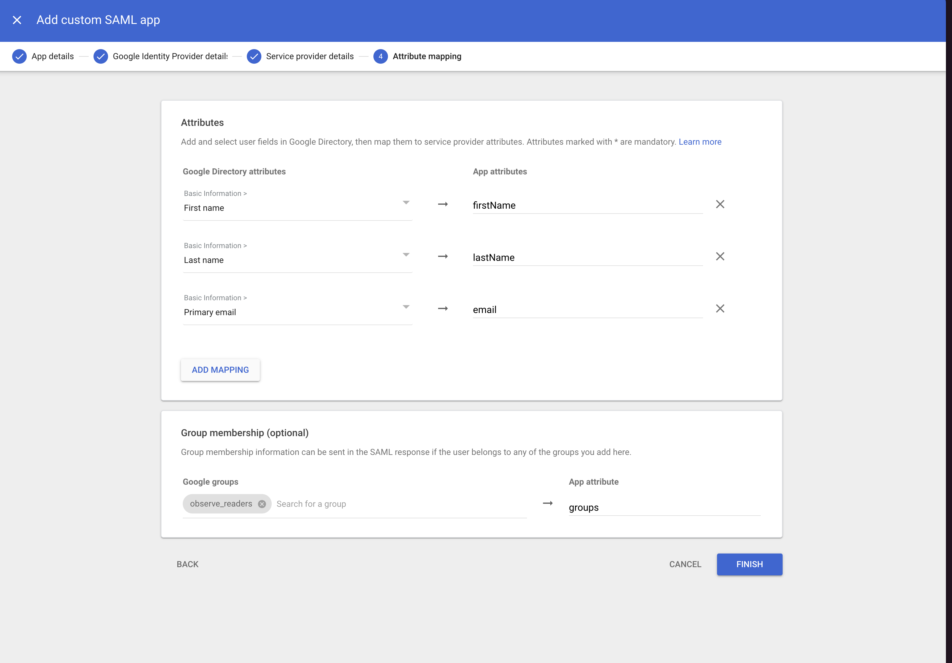 To map attributes, click Add Mapping and use the following Google Directory attributes and App attributes: