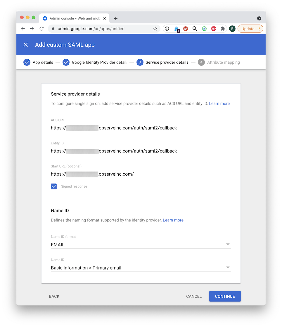 - Return to the Observe app configuration page on Google.
