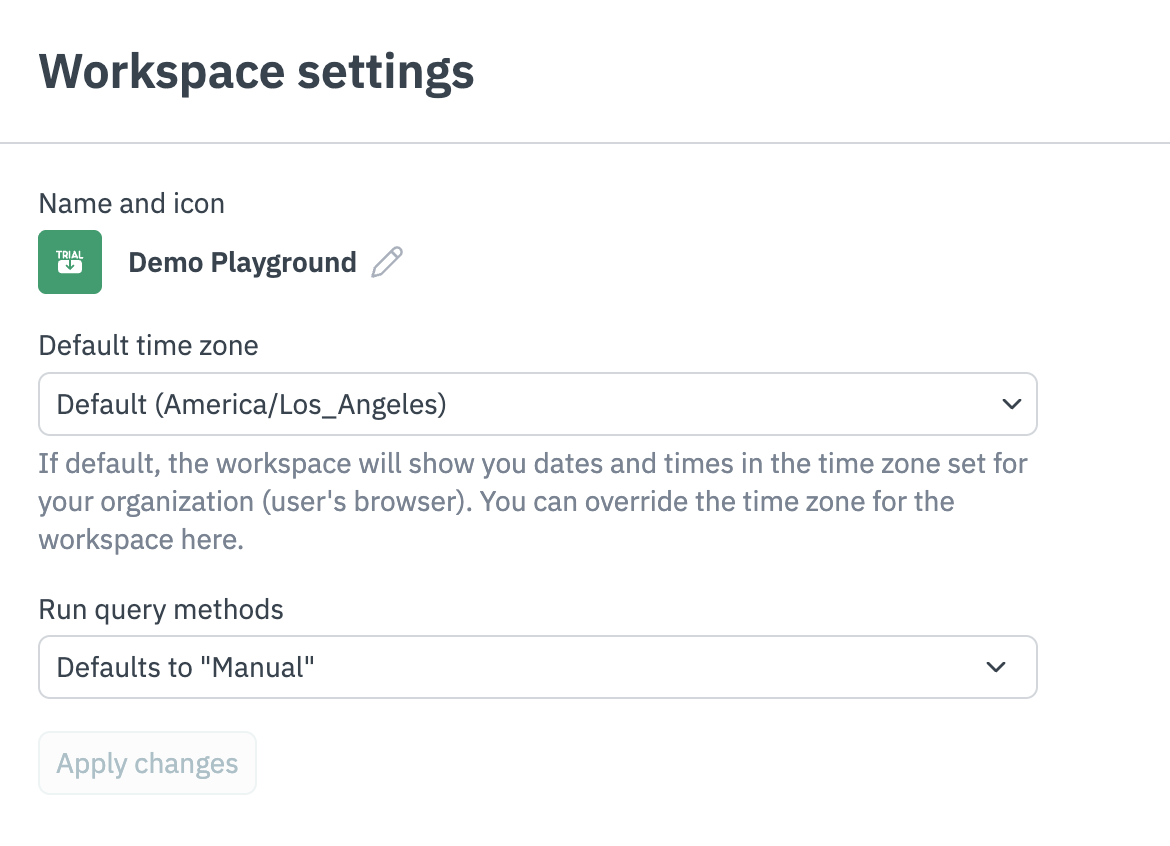 - Workspace Name and Icon - Click the Pencil icon () to change the name of the workspace. Click the icon to select a new icon; use the type-ahead search window to find a good image.