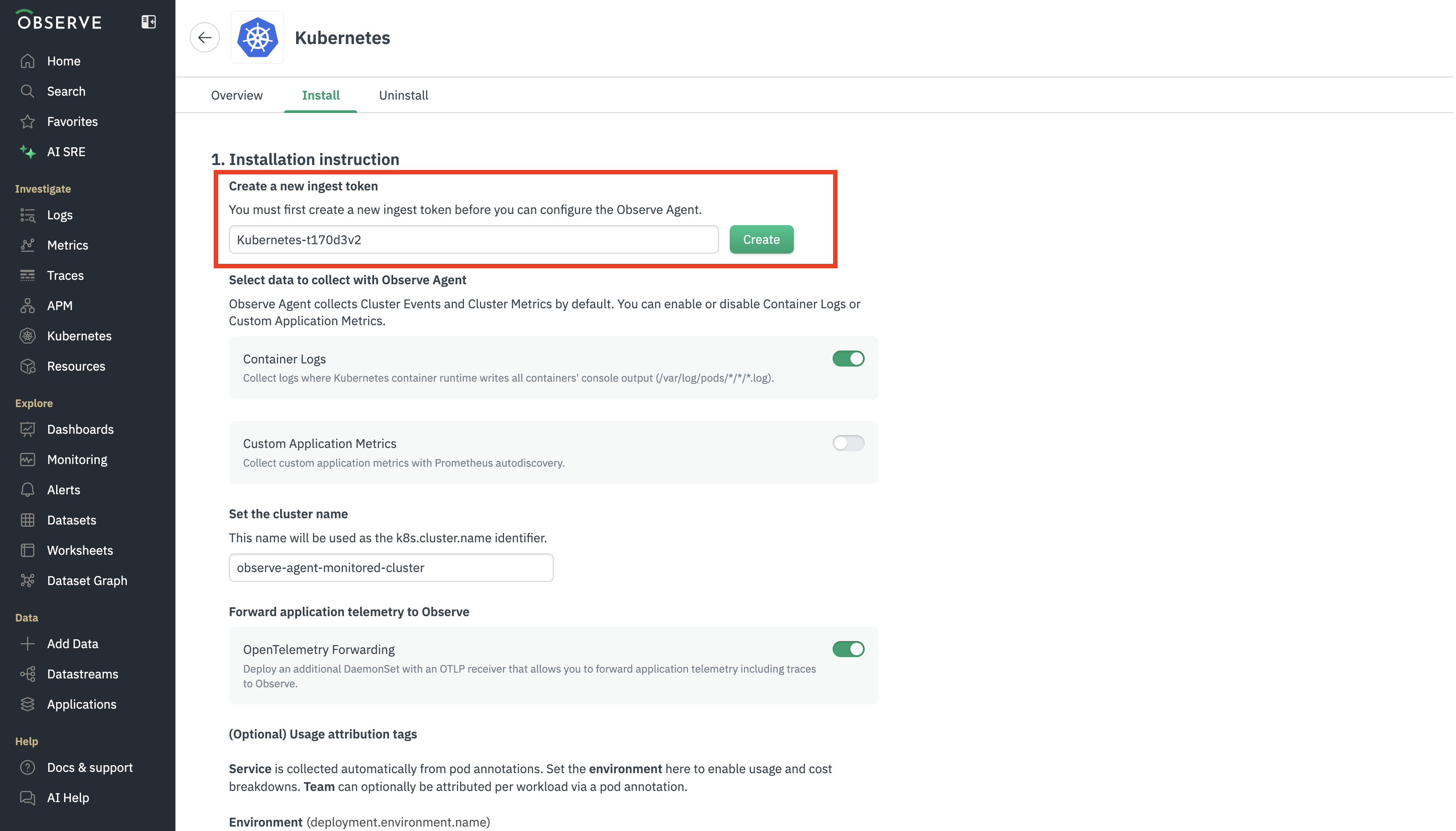 As part of this setup, you will create an ingest token to authenticate the collector with Observe. Create separate tokens for each cluster, deployment, or team.