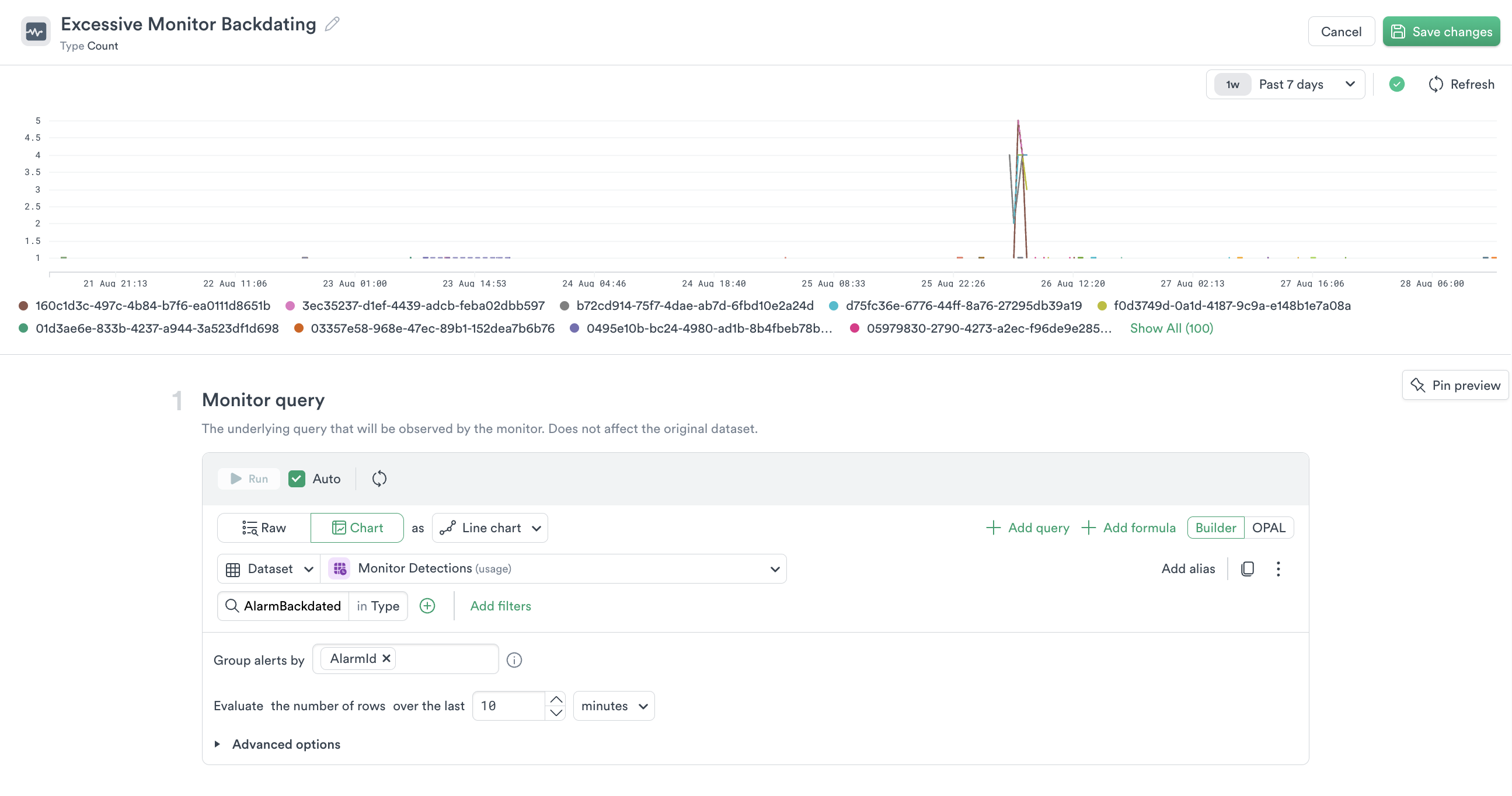 No matter how you've started a Count monitor, the flow is the same to proceed. First, review the Monitor query to ensure that it is gathering the data that you intend to monitor. Use the time selector at the top right of the preview panel. You have access to the entire set of Observe data manipulation tools: click Chart to organize the data, use filters to trim it, and add queries or formulas to enrich the monitor.