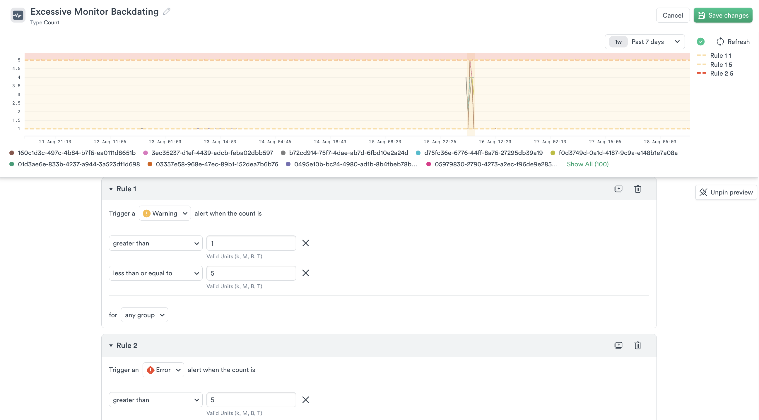 You can construct multiple rules in a monitor, using conditional tests from the data to set a severity level. The preview panel will update in real time so you can review where your rules are matching.