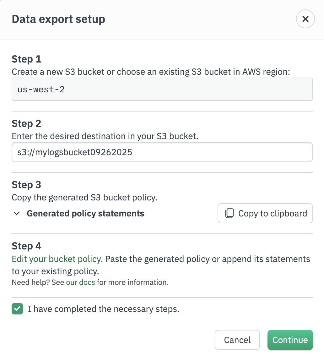 Before your create a data export job, make sure you have configured your S3 bucket to receive data from Observe. See Configure your S3 bucket to receive data from Observe.