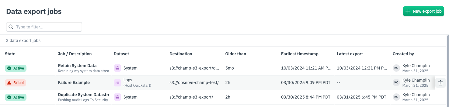 - Earliest timestamp, Latest timestamp: These describe the time range of data that has been exported by the job.