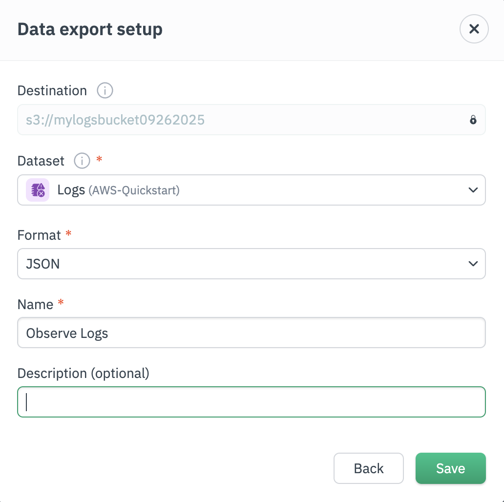 - Dataset - the name of the Dataset in Observe you want to export to your S3 bucket.
