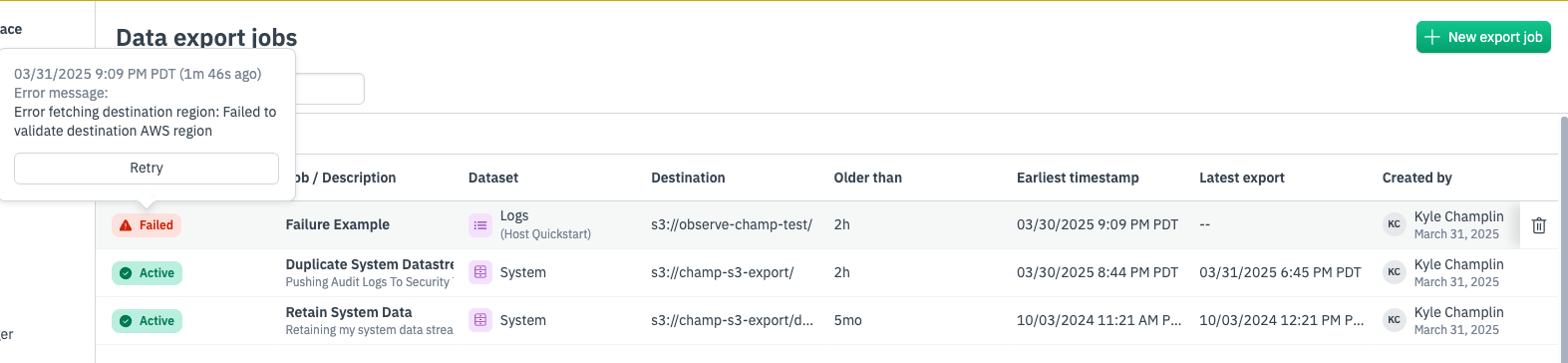 Hovering over the state pill will provide additional details as to why the export job has failed. For example, if your export job fails due to a misconfigured bucket policy, you can update the bucket policy and then retry the job.