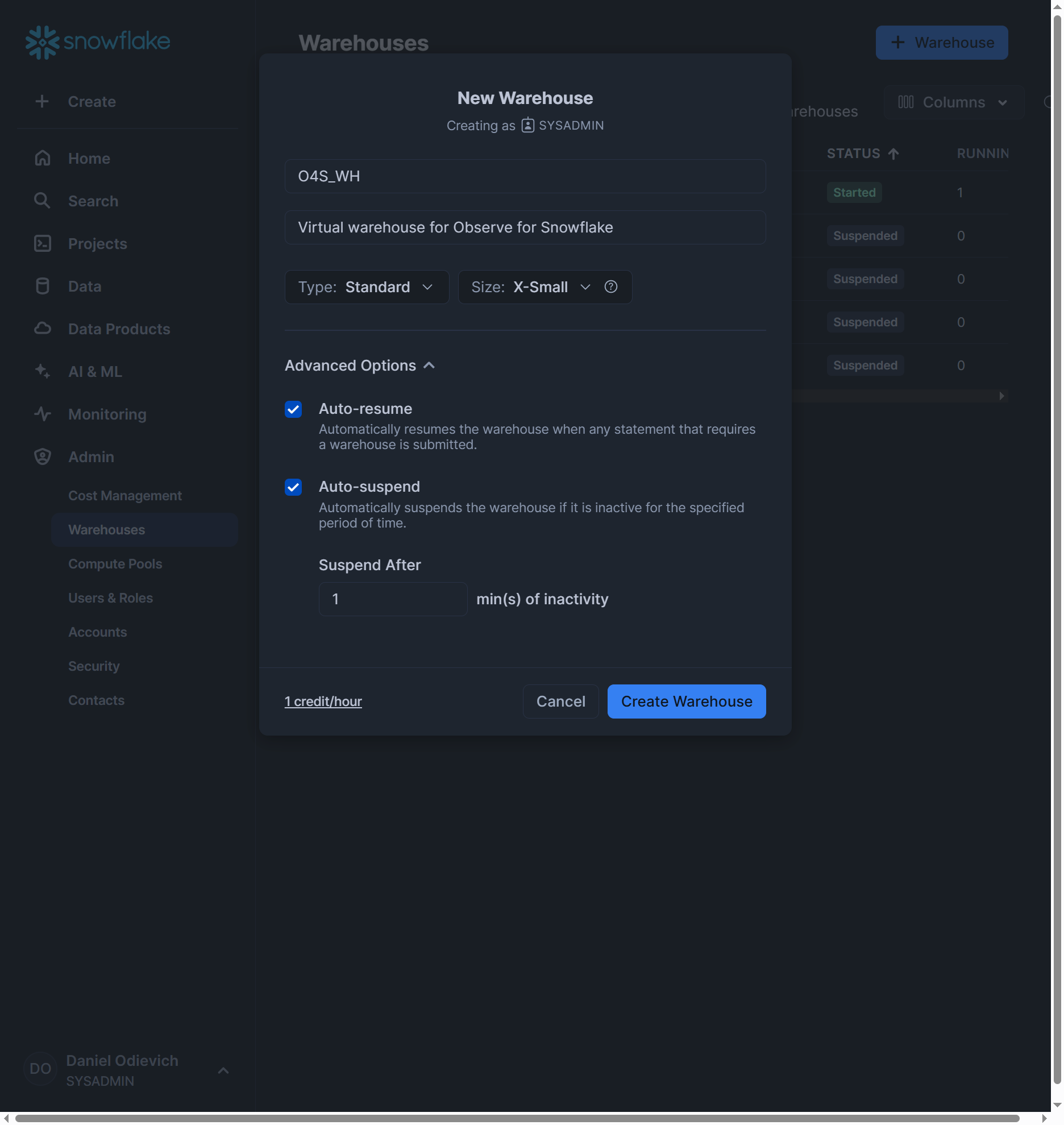 - Change to the SYSADMIN role or whatever role you use to create virtual warehouses.