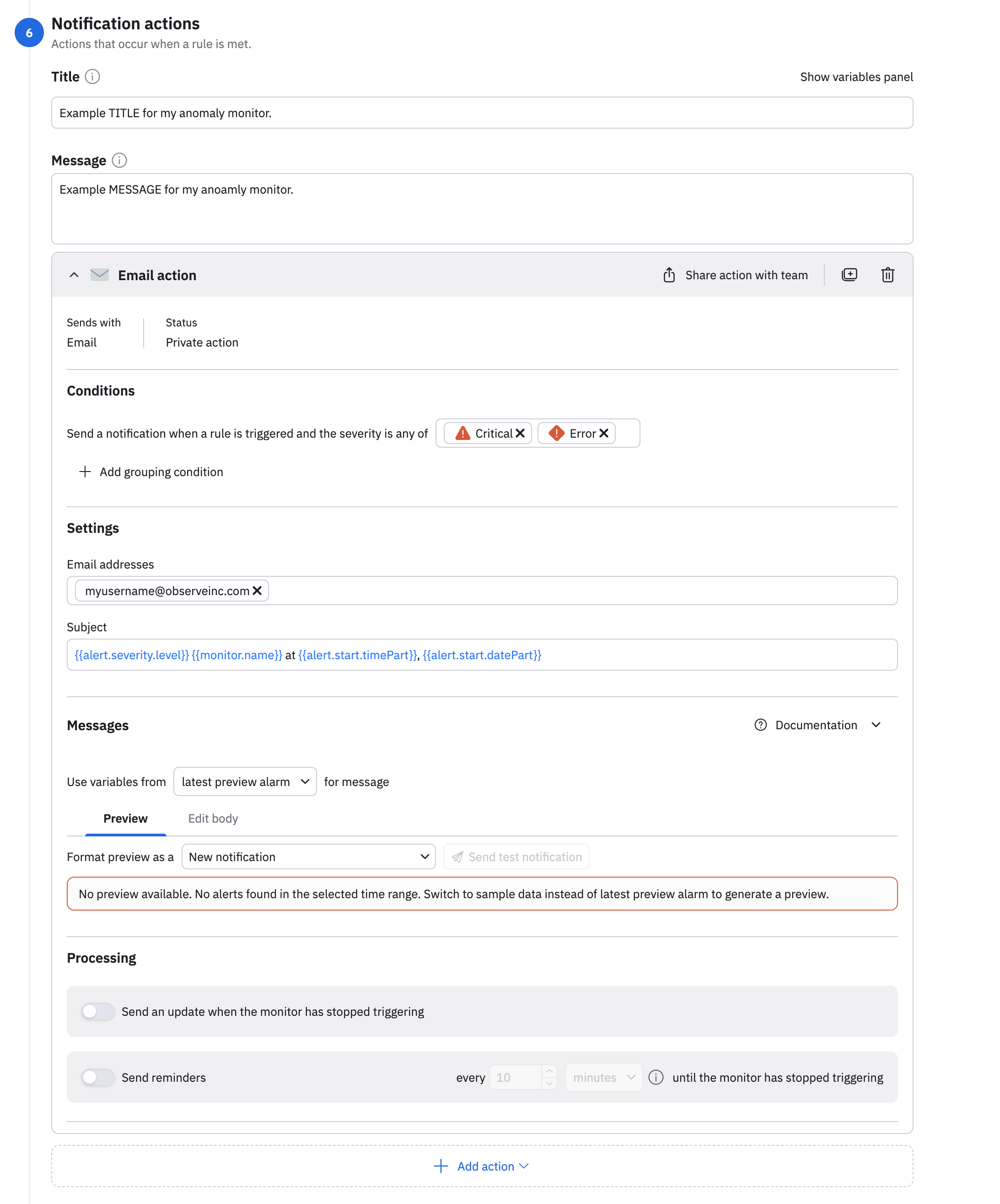 Configure the notification actions you want to launch when a rule is met. You can configure notifications actions using email, webhook, Slack, or PagerDuty. Below is an email example: