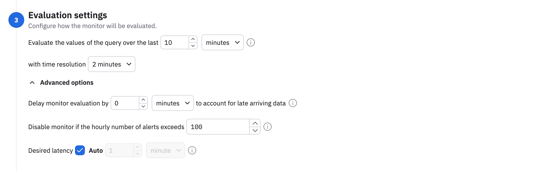 - Desired latency - how quickly the monitor responds to new data. The default is auto, where an efficient latency is selected for you, based on your query.