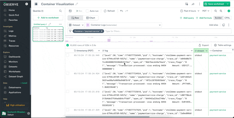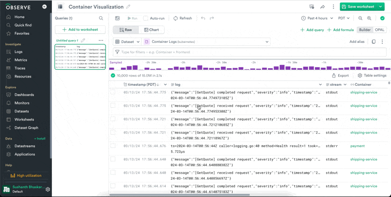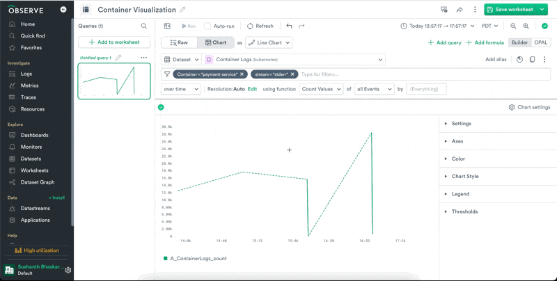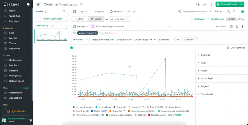 In order to zoom out and see all errors for all services, let's remove the filter for payment-service and group the chart by Container. We can see that payment-service really is erroring at a high rate. We've found something interesting here and now we can share our worksheet with our team to continue the investigation.