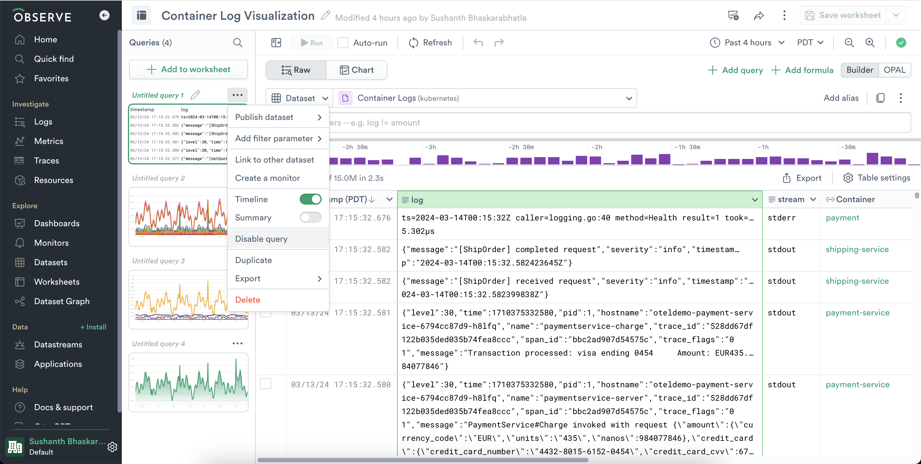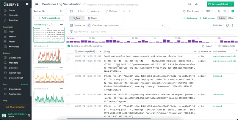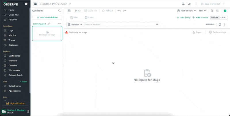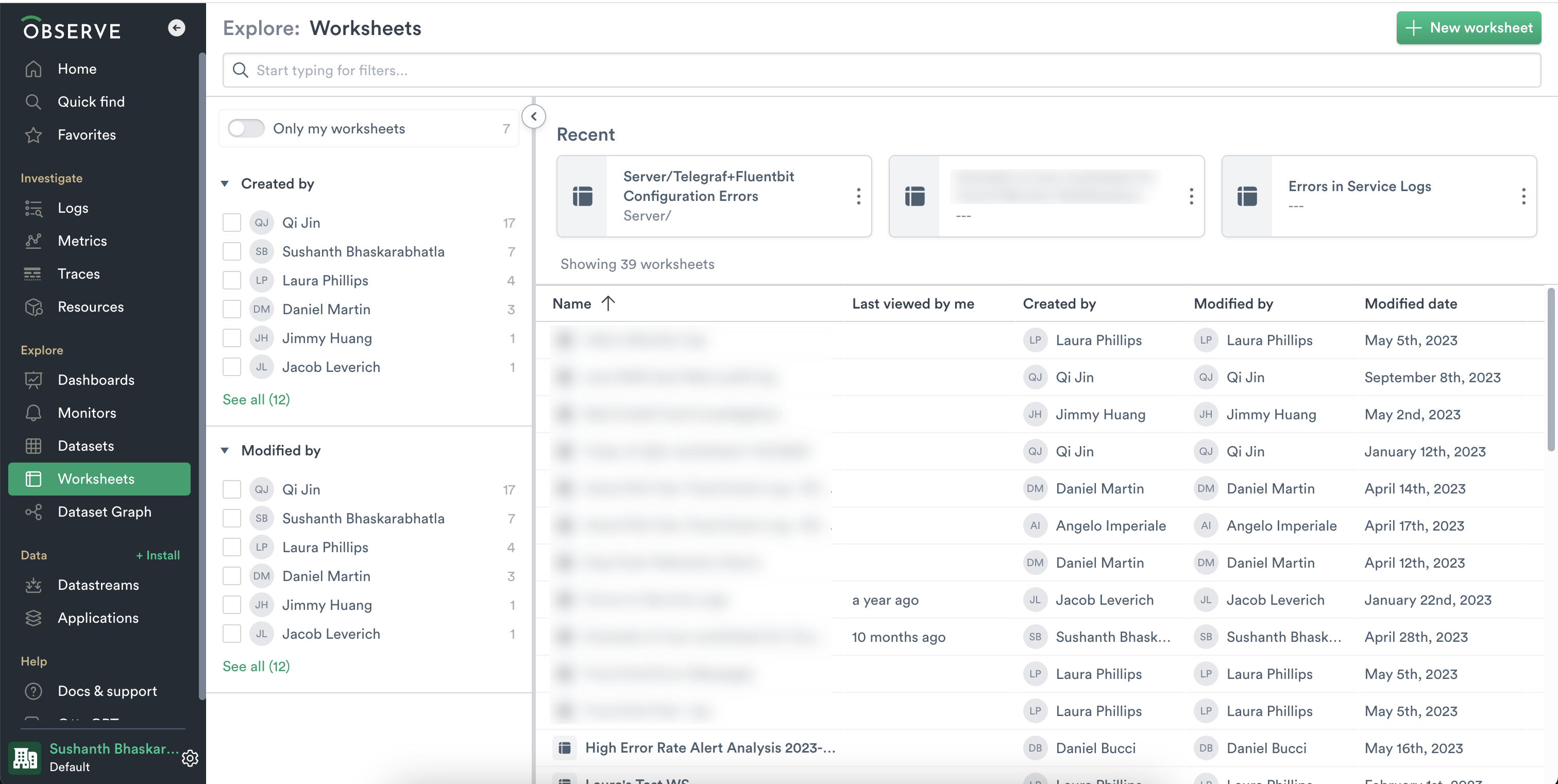 From the left navigation, click on Worksheets to view all the Worksheets in your Observe instance.