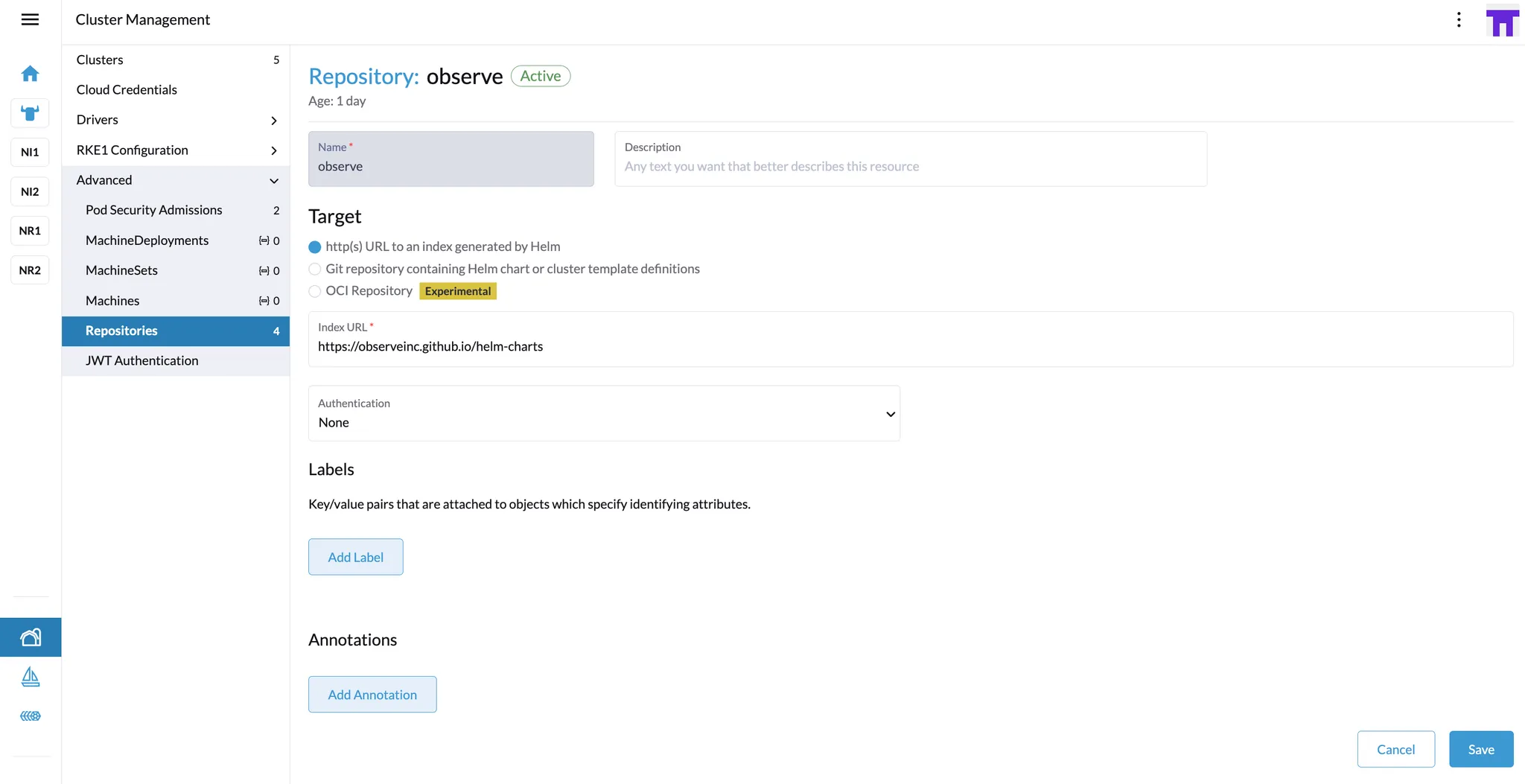 In Rancher, go to Cluster Management > Repositories.