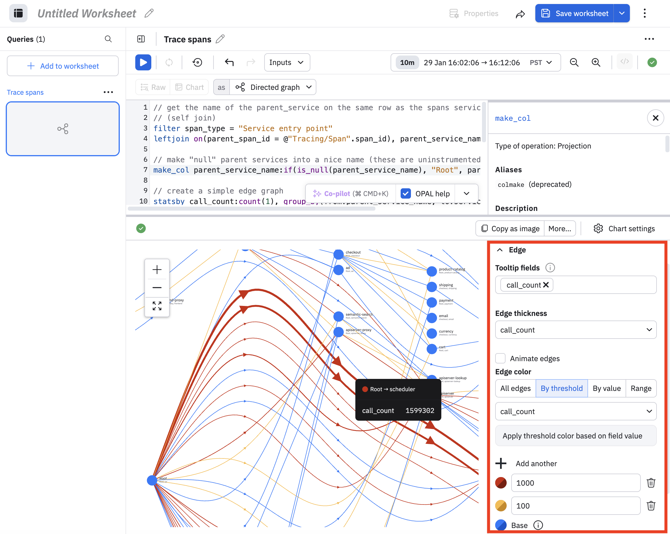 - Configure the color of the edges. If the call_count is 100o or more, then use red. If the call_count is between 100 and 999, use yellow. Otherwise, use blue, which is the base color.