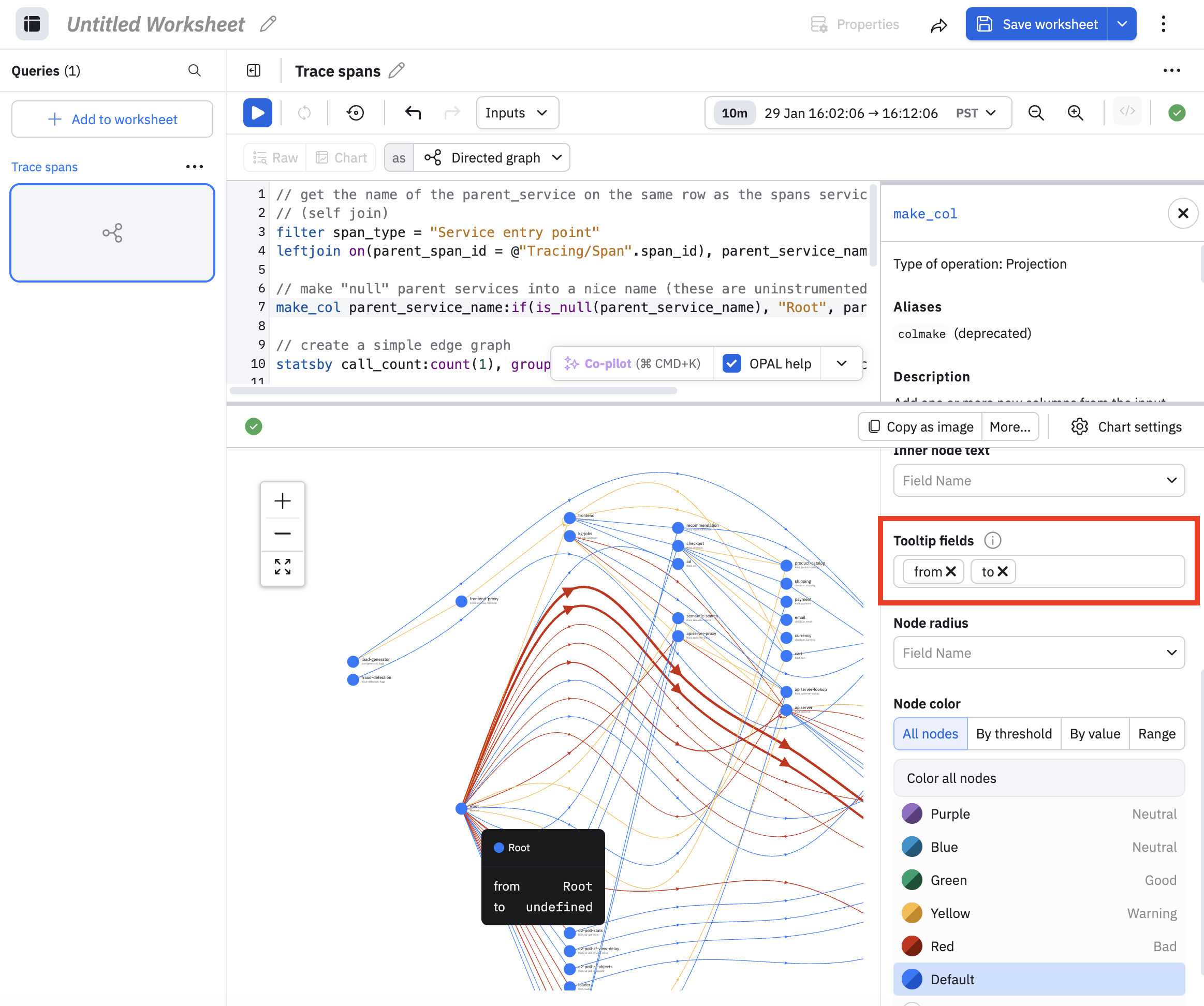 You can see the thicker red lines in the example, indicating that the call_count is greater than 1000. Use the Tooltip Fields to configure what you see in the tooltip when you hover on any edge. By default, each tooltip shows the source and destination fields. In this example, we also added the call_count.