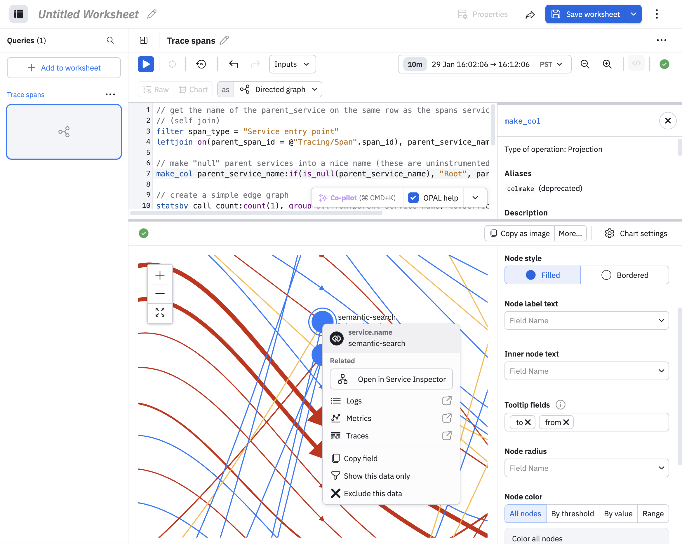Like edges, you can click on any node to pivot to logs, metrics, and traces, or click Open in Service Inspector to go to the Service Explorer.