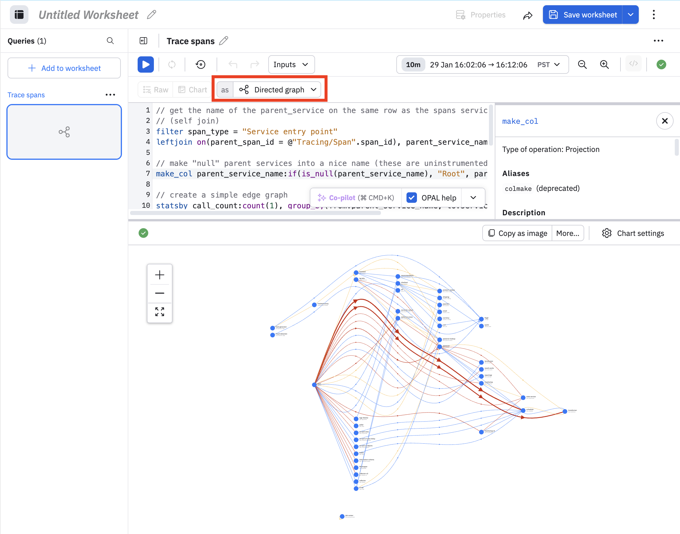 To view a DAG, access the log or Worksheet and select Directed graph as the chart type. Here is an example from a Worksheet: