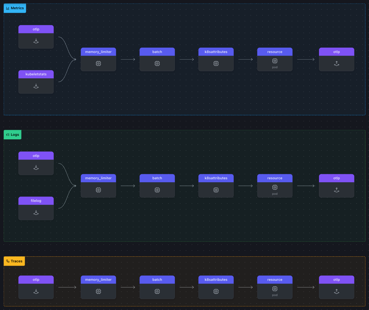 processors: [memory_limiter, batch, k8sattributes, resource/pod]