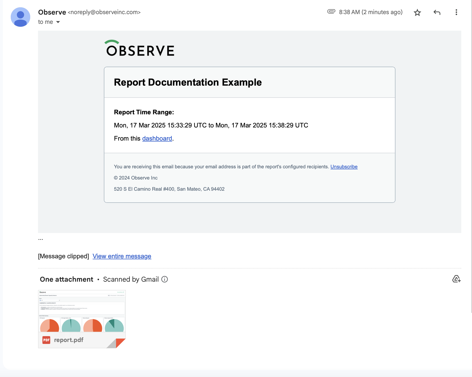 The resulting report PDF file is sent to email addresses that you specify, and is included as an email attachment.