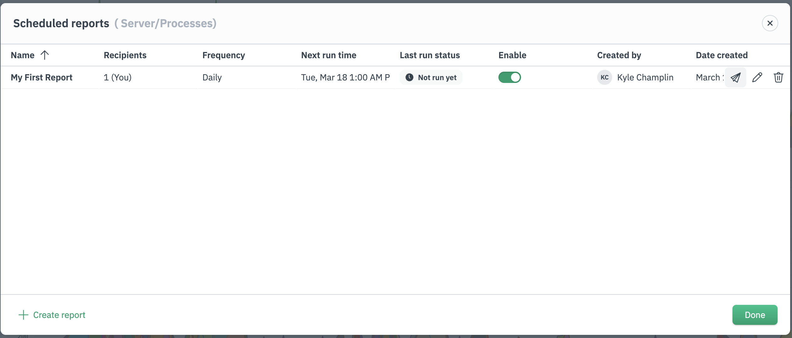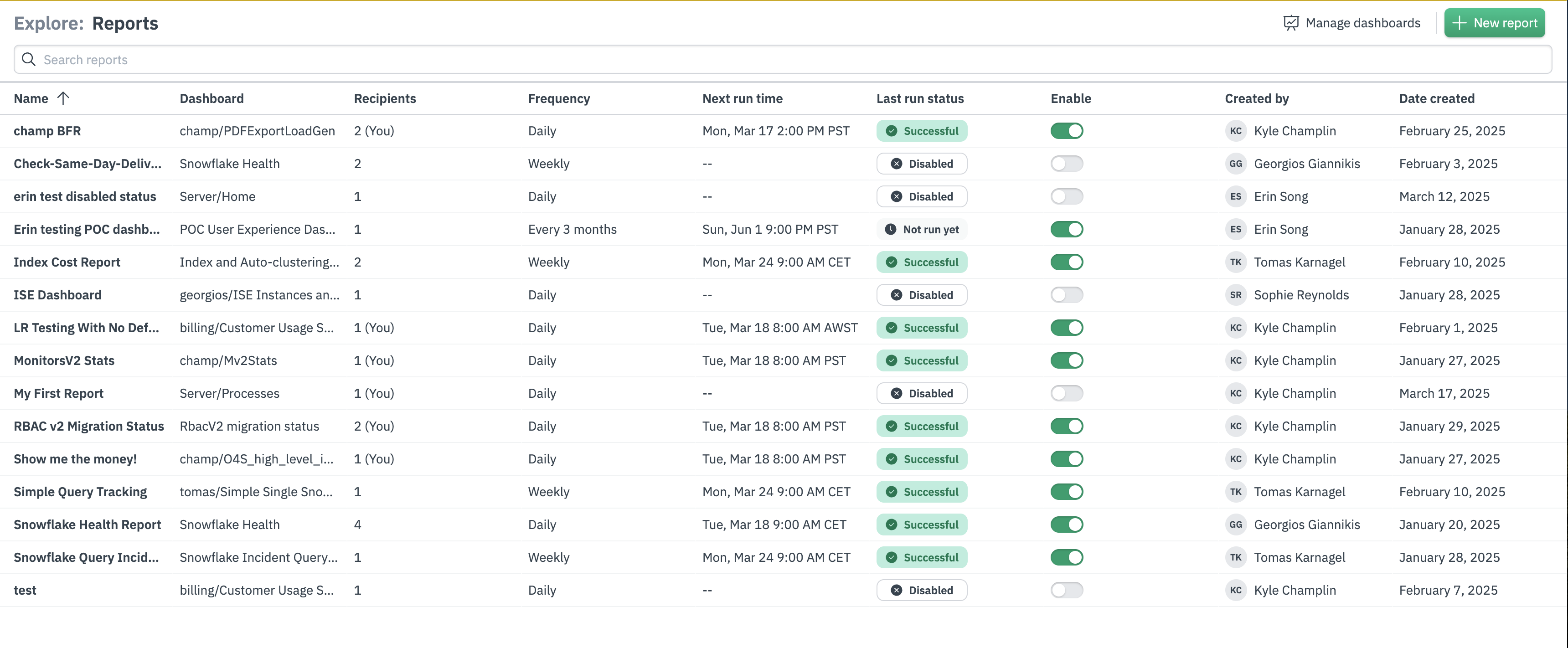 From this modal you can enable and disable the report, send a test report, edit the report configuration or delete the report. You can also troubleshoot report failures as needed, by hovering over the Last run status chip.