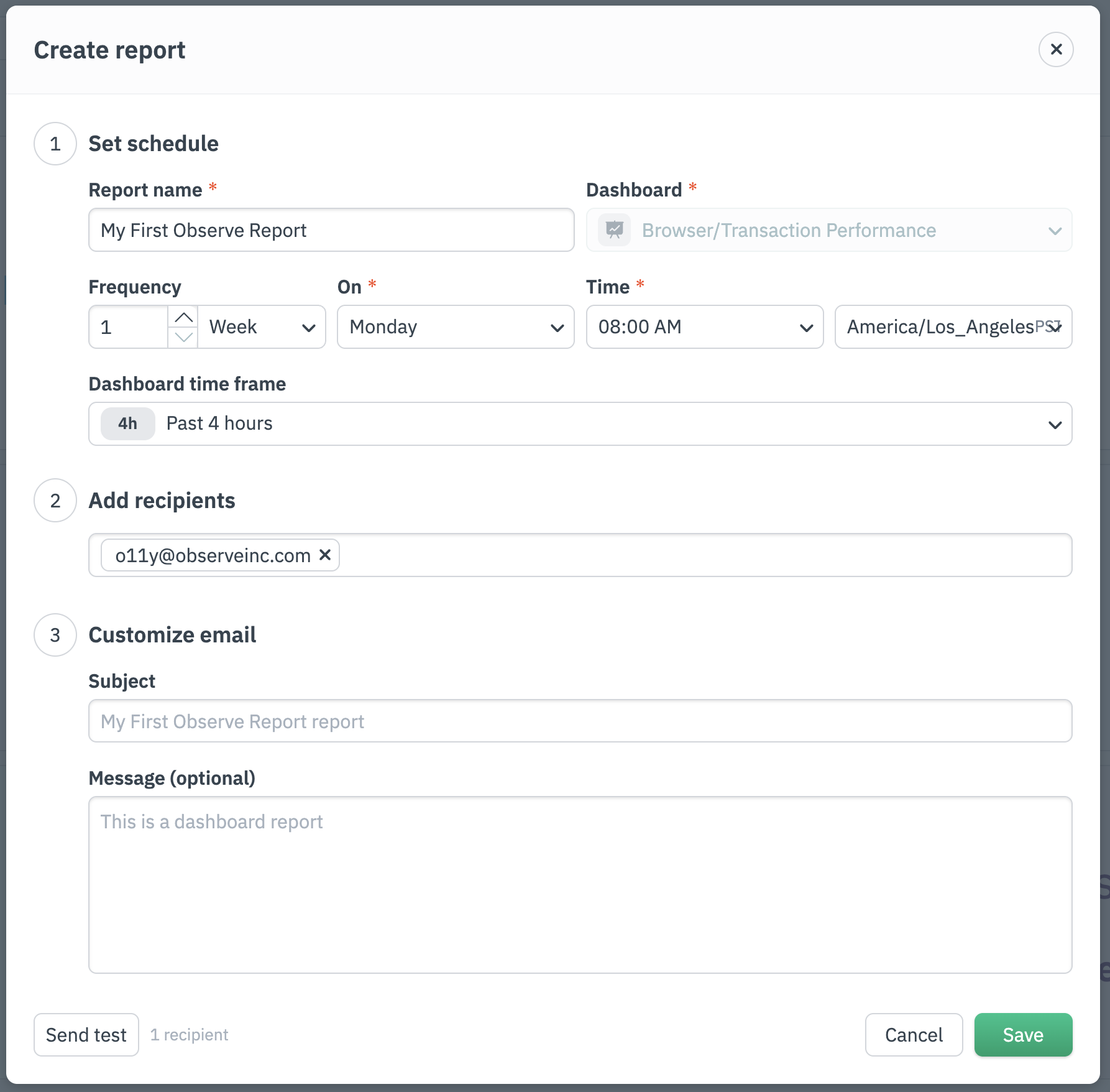Report Name- This is the name of the reporting job that you can reference later.Dashboard- This is the dashboard that the report will be generated from.Frequency- This the schedule that determines when and how often the report is sent.Dashboard time frame- Select a range of time that will be used in the resulting report. The report time frame can be different from the default time frame displayed on the dashboard.Add recipients- Add email recipients to your report, enter their email addresses. You can remove yourself as a recipient by clicking thexnext to your email. You can send reports to recipients outside of your organization.Customize email- Provide a custom subject and/or message in your report email. These are not required and support plaintext.Send test- Clicking this button lets you send an example before saving the schedule.
