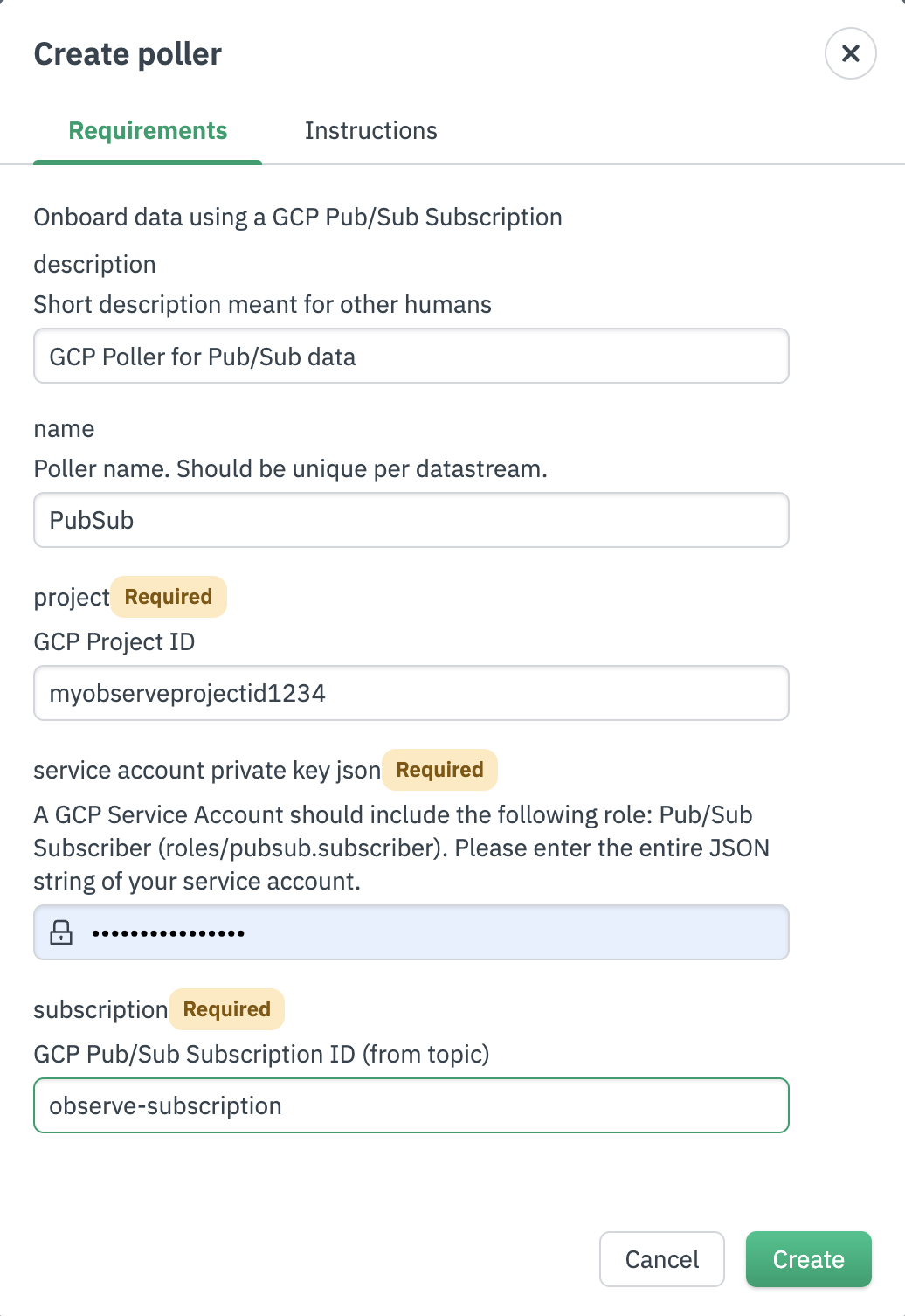 - In the GCP Pub/Sub Subscription field, enter the subscription name you saved in your configuration with Terraform or downloaded from the GCP Console.