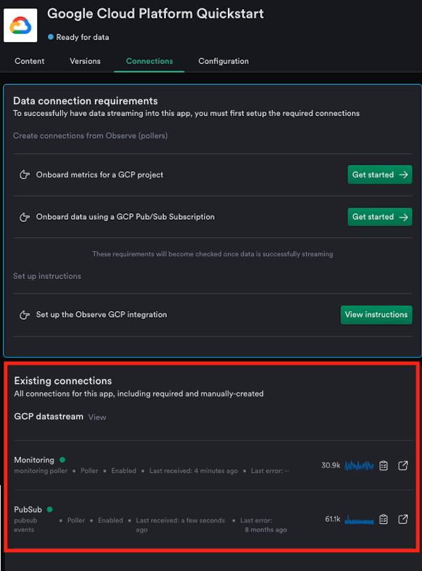 - Return to the app and look under Existing connections to verify that Observe is receiving data from Google Cloud Platform.