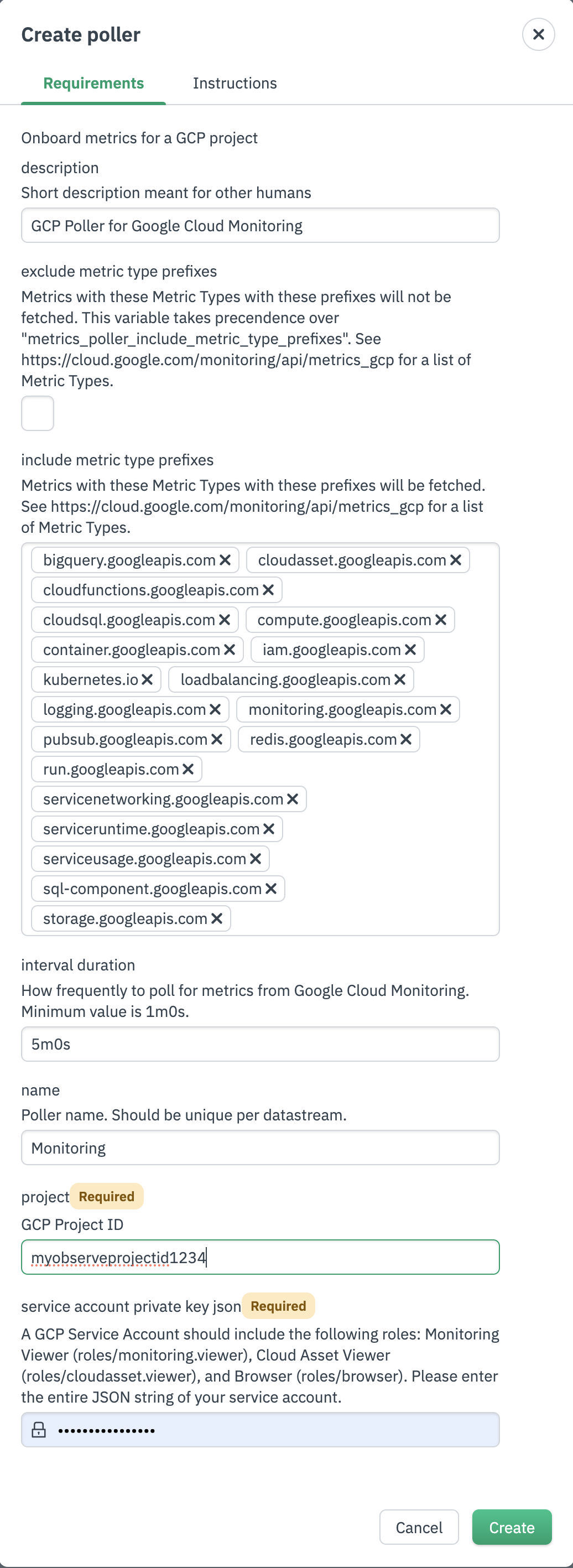 - Click Get started next to Onboard metrics for a GCP project to begin creating a poller.