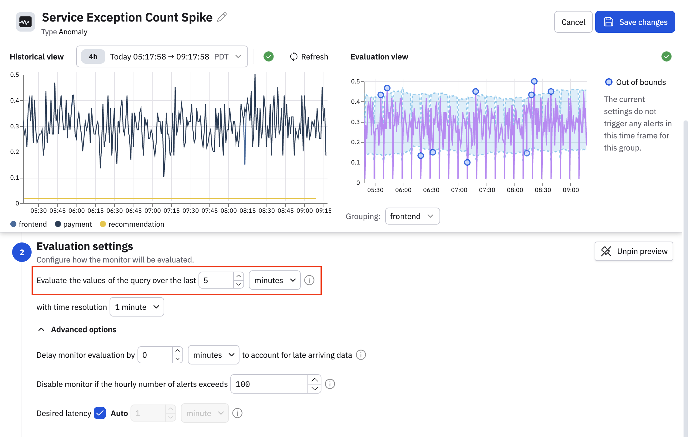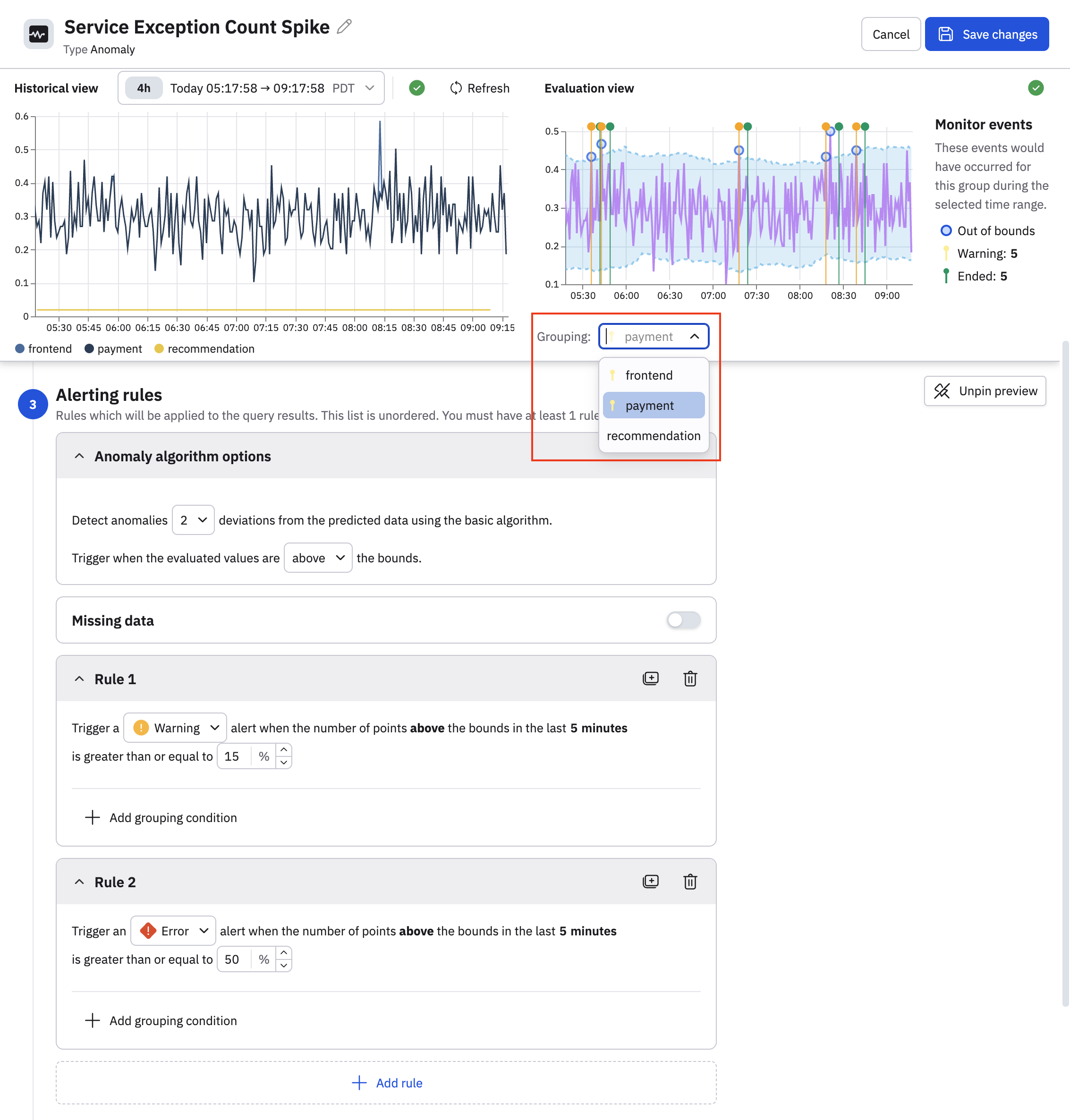 In the Evaluation view, you can see now that these rule parameters do generate some alerts. There are 5 warnings generated for the frontend service, you can click the dropdown in the Grouping field and select another service to see if there are alerts for those services as well.