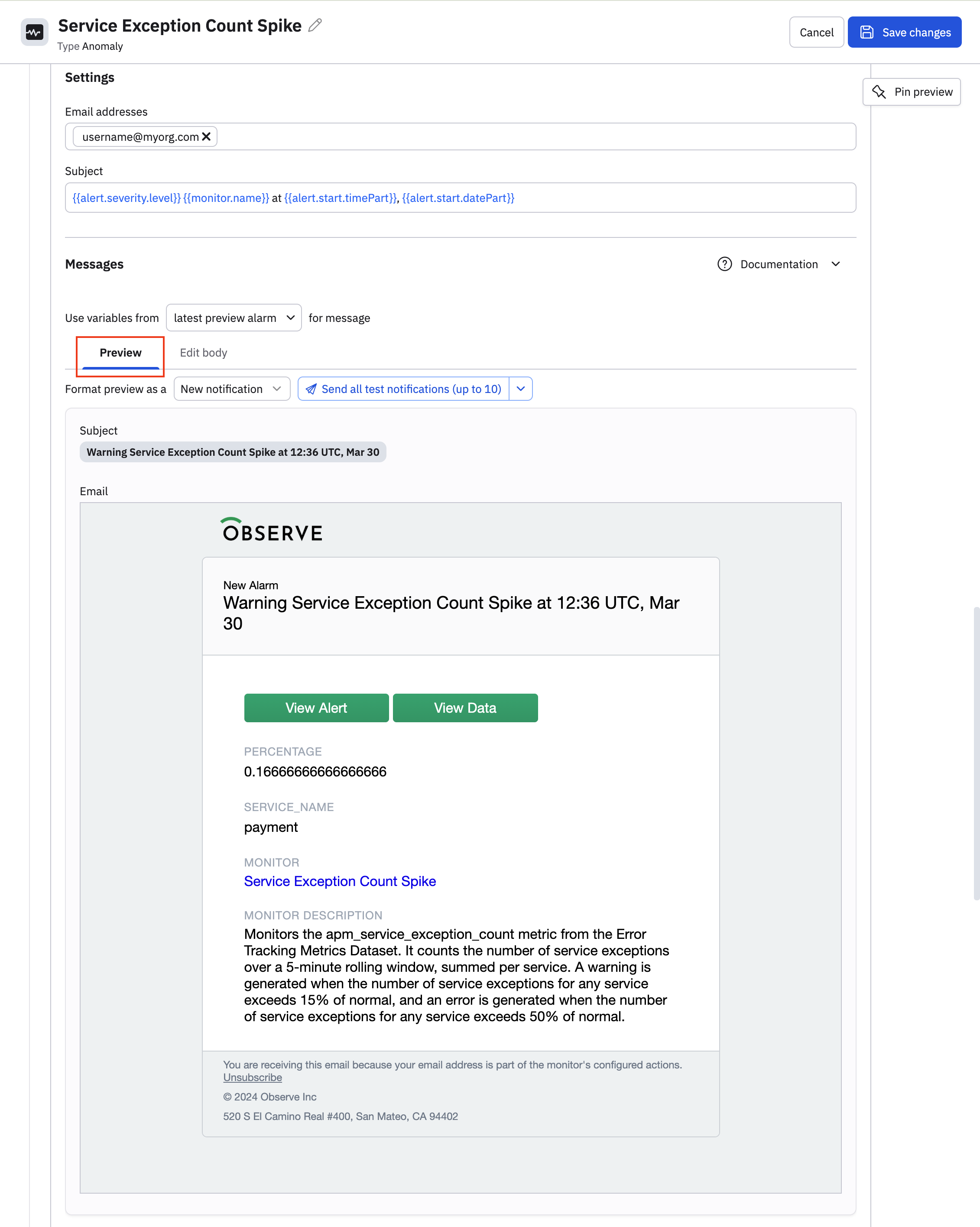 {{monitor.variables.title}}for the title, and{{monitor.variables.message}}for the message. See the Mustache template reference. - Configure the email to send a message any time a warning is generated.