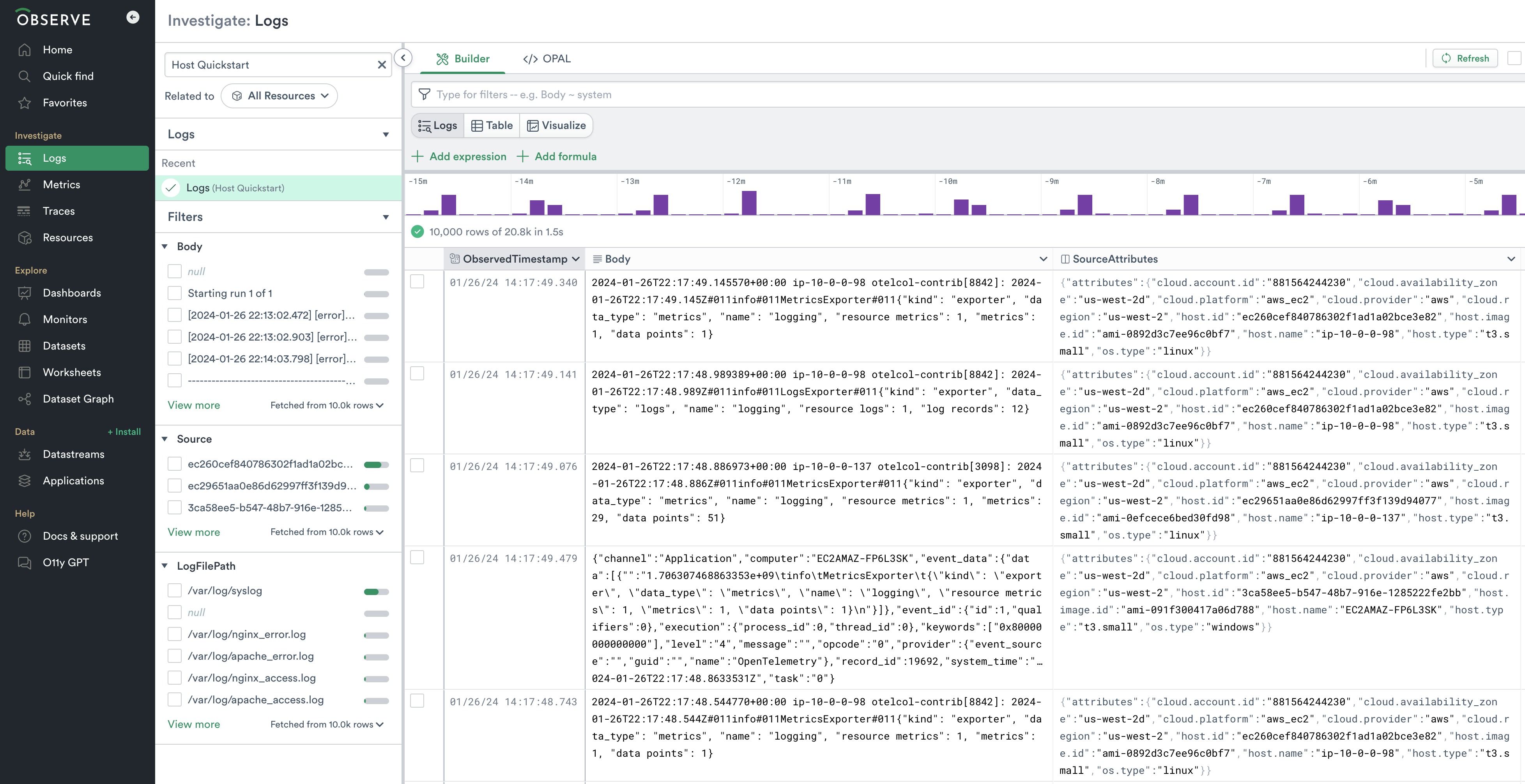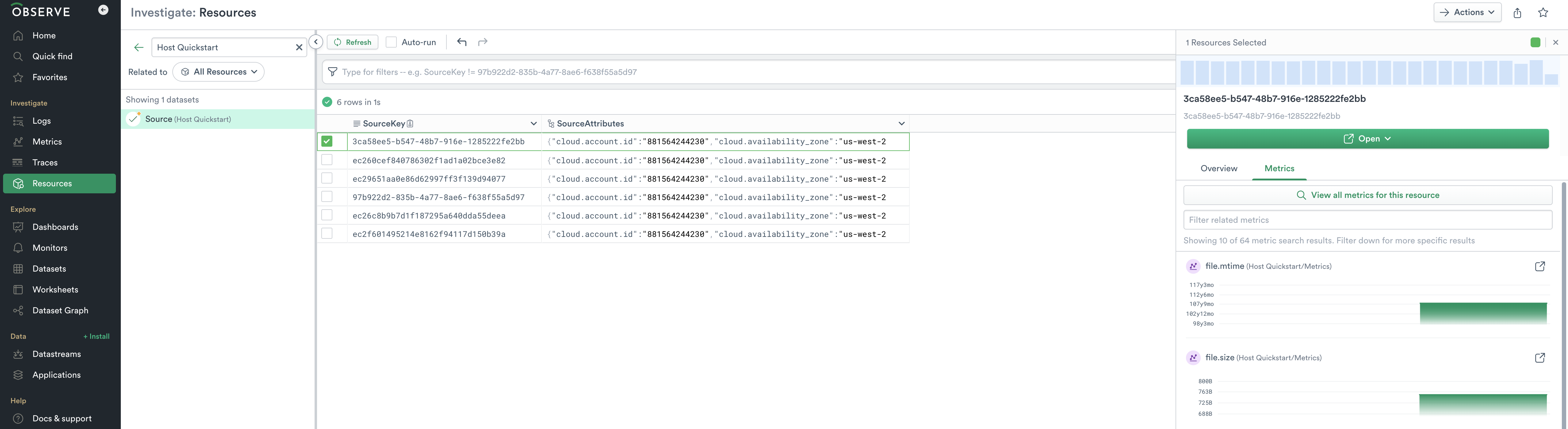- A resource Dataset (Source) to quickly show you the hosts your are monitoring that links to associated logs and metrics.