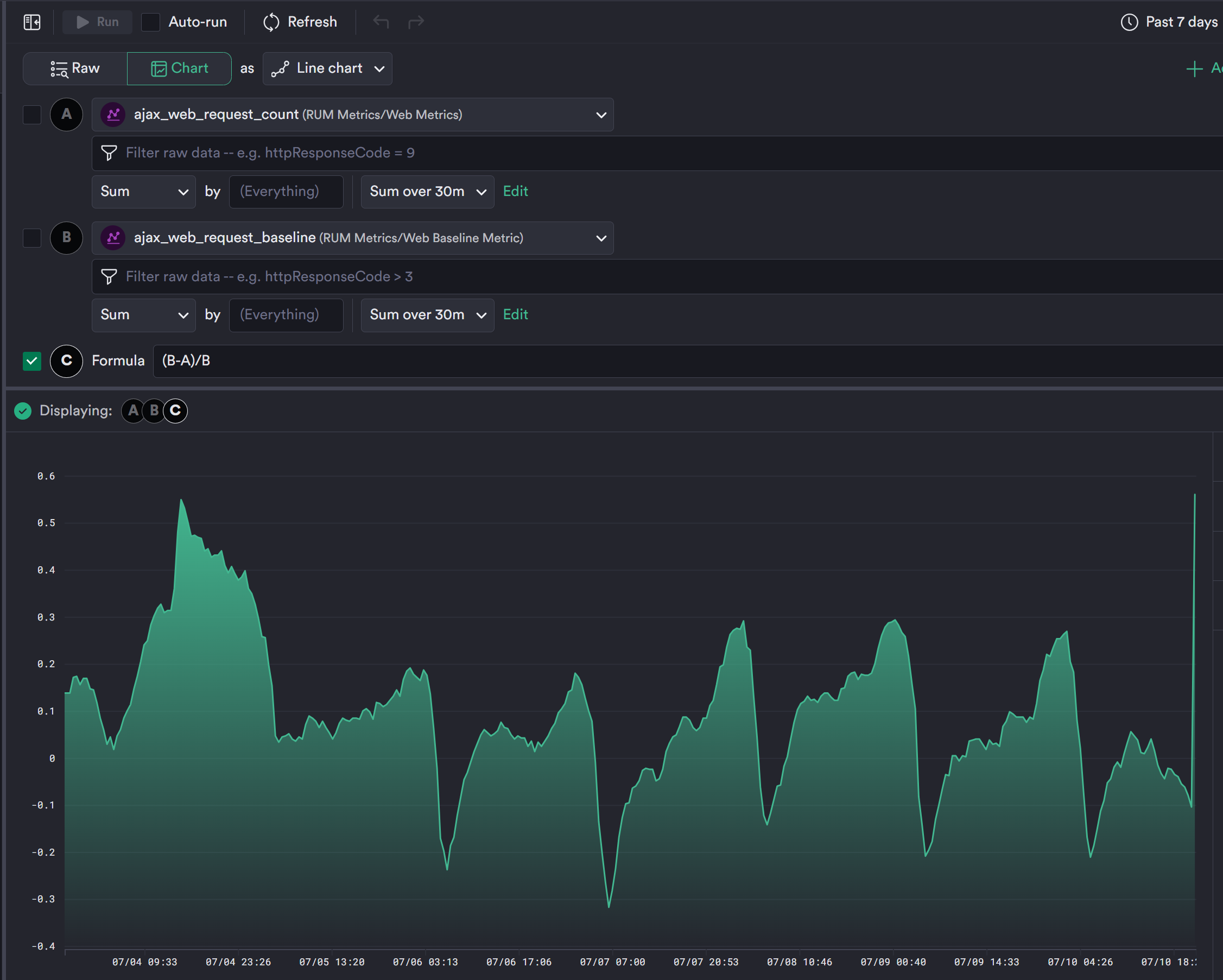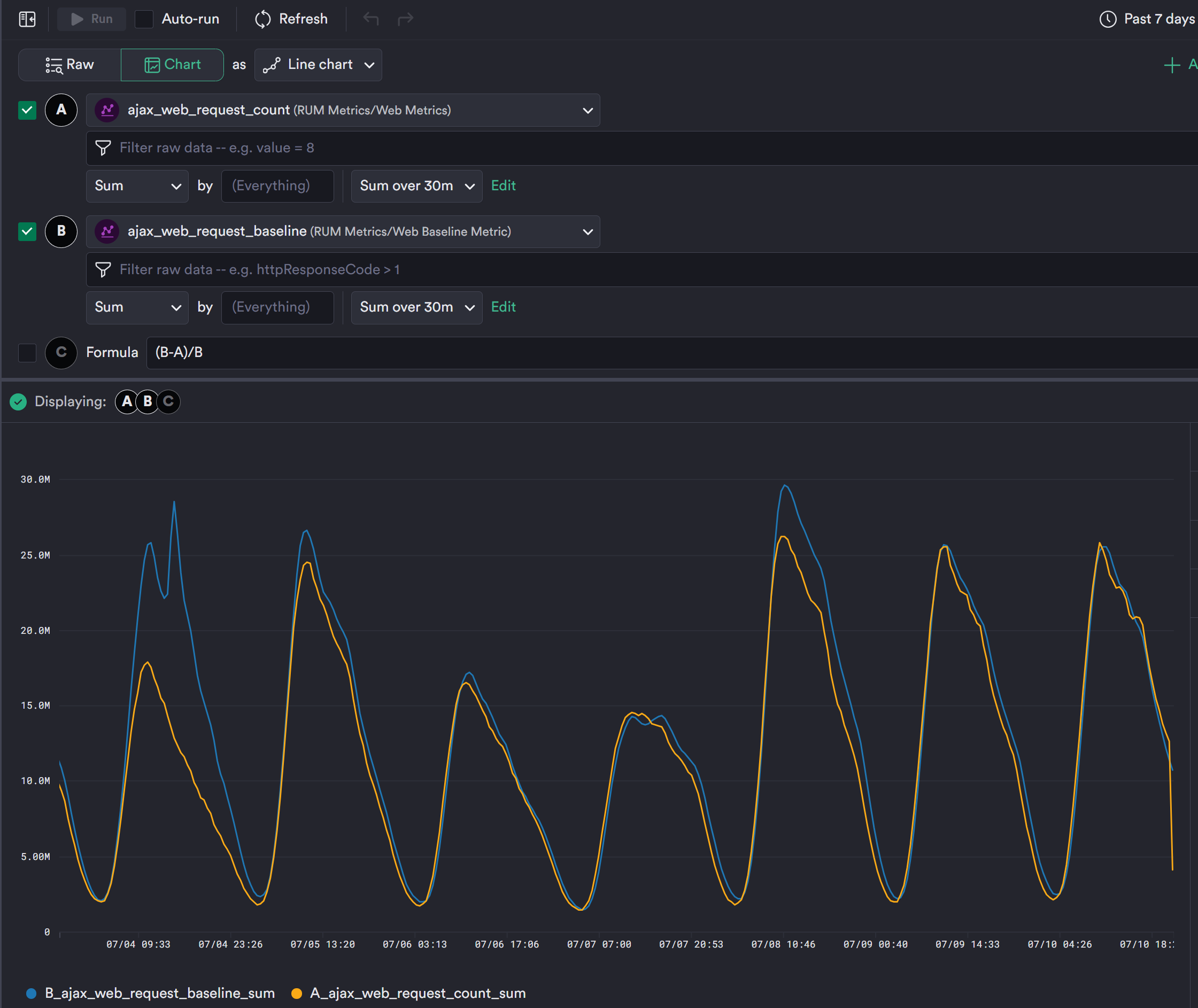 Open the resulting metric in Metrics Explorer and use the expression builder to compare ajax_web-request_count against ajax_web_request_baseline.